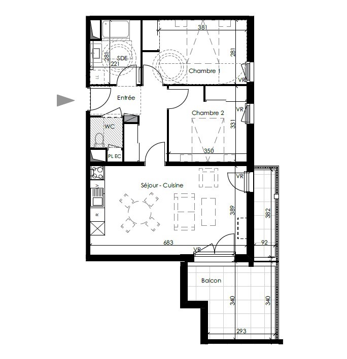 T3 NEUF de 66.43 m² avec un agréable balcon de 15.22 m². Il se compose d'une entrée, d'une pièce de vie ouverte sur une cuisine équipée (évier, plaque de cuisson, hotte, meubles de rangement) prolongée par l'extérieur. Vous profiterez également de deux chambres, d'une salle d'eau (douche, meuble vasque, miroir) et WC séparés. Chauffage et eau chaude compris dans les charges.
