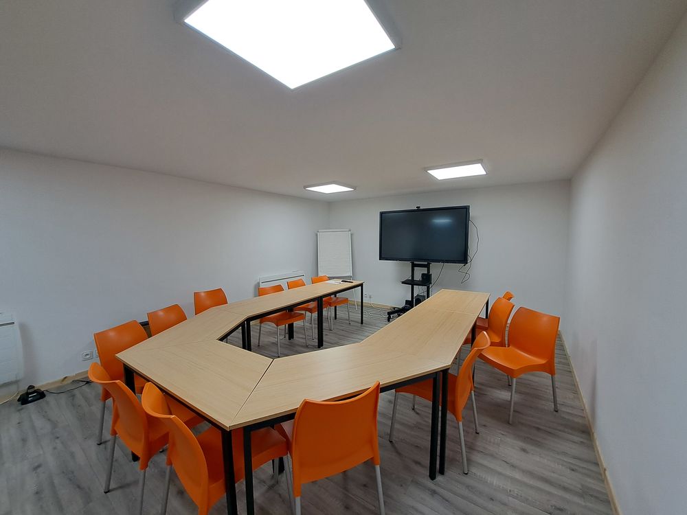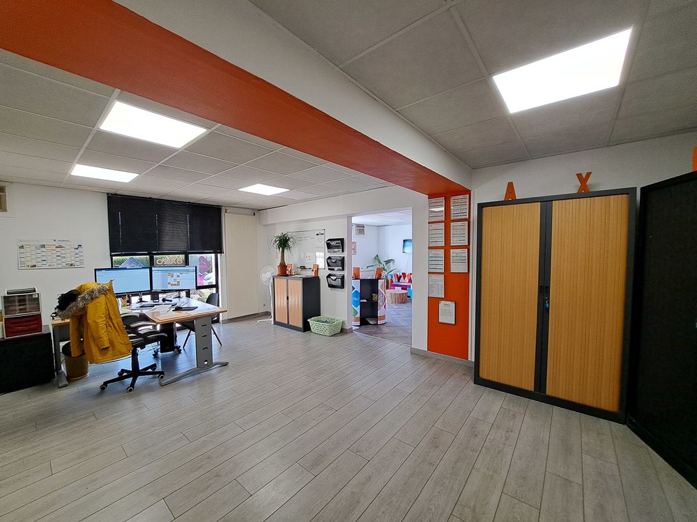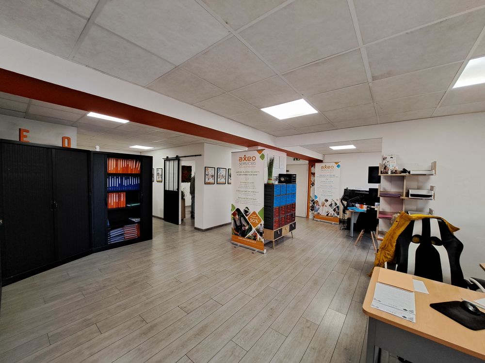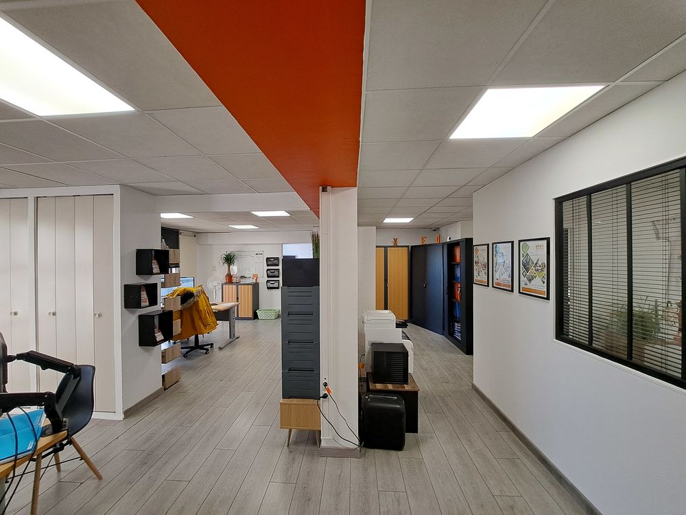 Local commercial de 170m² de plain pied avec une entrée, 3 bureaux et un open space avec plusieurs bureaux, salle de réunion, salle de pause, et pièce sanitaire, une pièce archives ou entrepôt.