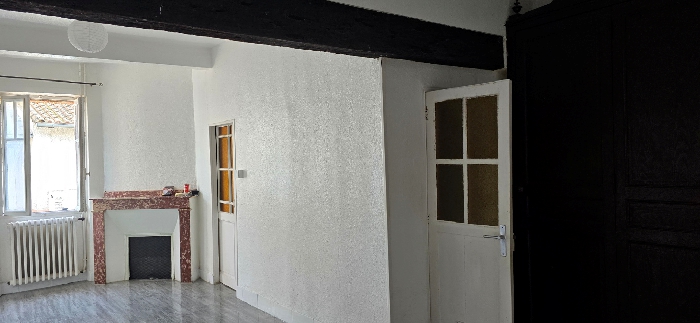 Vous trouverez un grand séjour lumineux avec un placard de rangement. La cuisine est équipée et séparée avec une fenêtre.