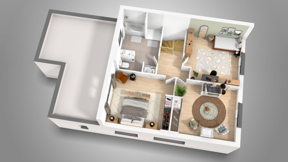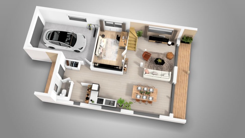 À l'intérieur, le rez-de-chaussée s'organise autour d'un vaste espace de vie lumineux, ouvert sur le jardin. La cuisine, le salon et la salle à manger s'y déploient dans une atmosphère conviviale, où l'on imagine déjà les repas animés et les soirées cocooning. Un bureau y trouve naturellement sa place, offrant un coin calme pour travailler ou étudier. Un grand cellier-buanderie et des sanitaires complètent l'agencement avec praticité.