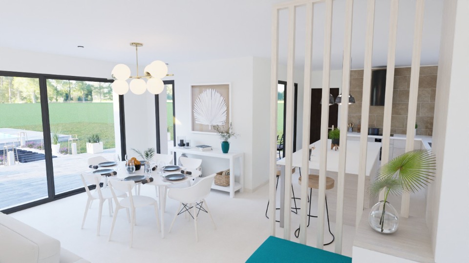 Son architecture audacieuse joue sur les décrochés pour créer différentes ambiances au sein de la pièce de vie, offrant ainsi confort et convivialité.