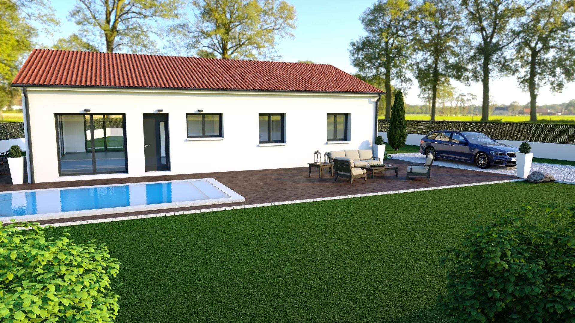 Nous vous proposons de réaliser une maison de plain-pied offrant un espace de vie confortable avec un accès terrasse, un garage attenant et ses 3 chambres, salle de bain.