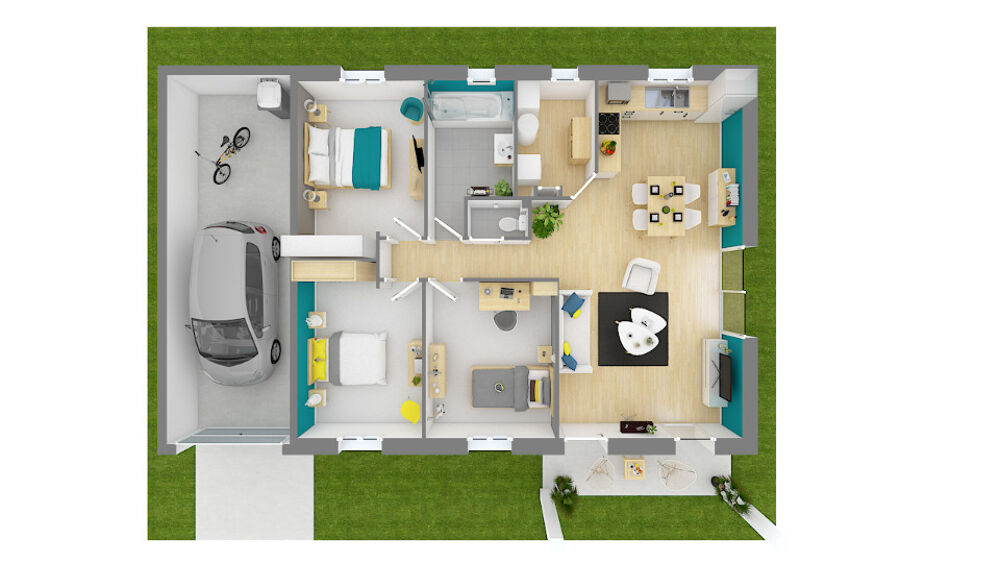 Elle inclut trois chambres, une cuisine et deux salles de bains. Cette maison est neuve.