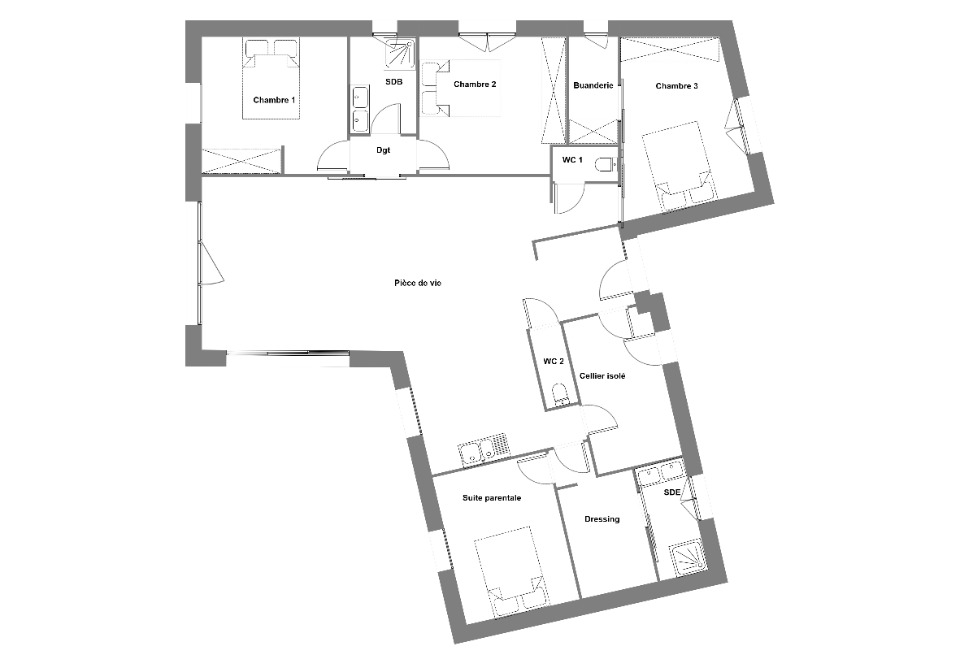 Nous vous proposons les plans d'une maison de plain-pied au style contemporain, pensée pour allier confort et performance énergétique.