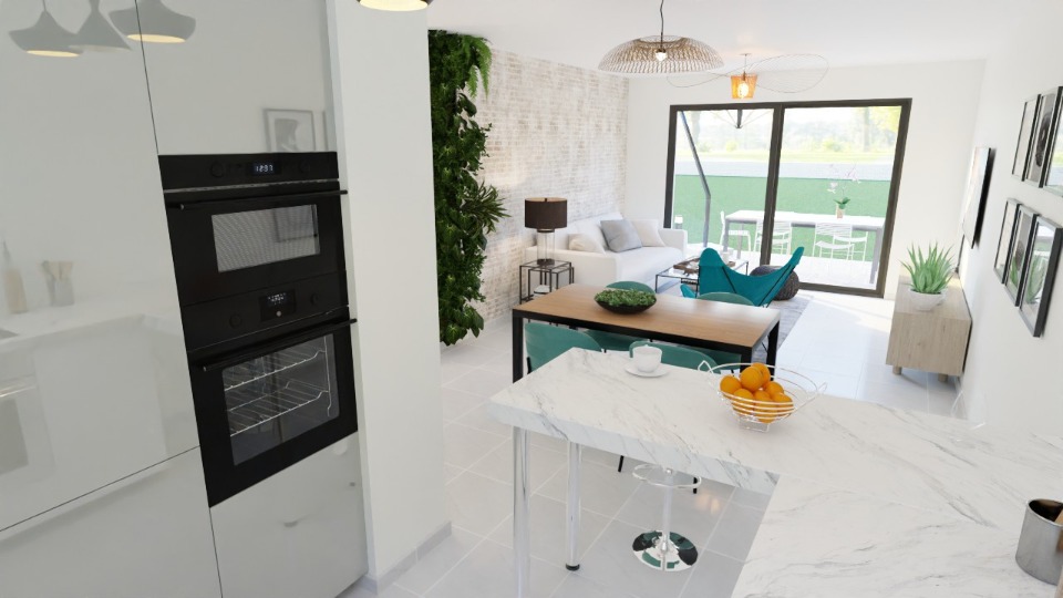 Cuisine ouverte sur séjour et salle à manger