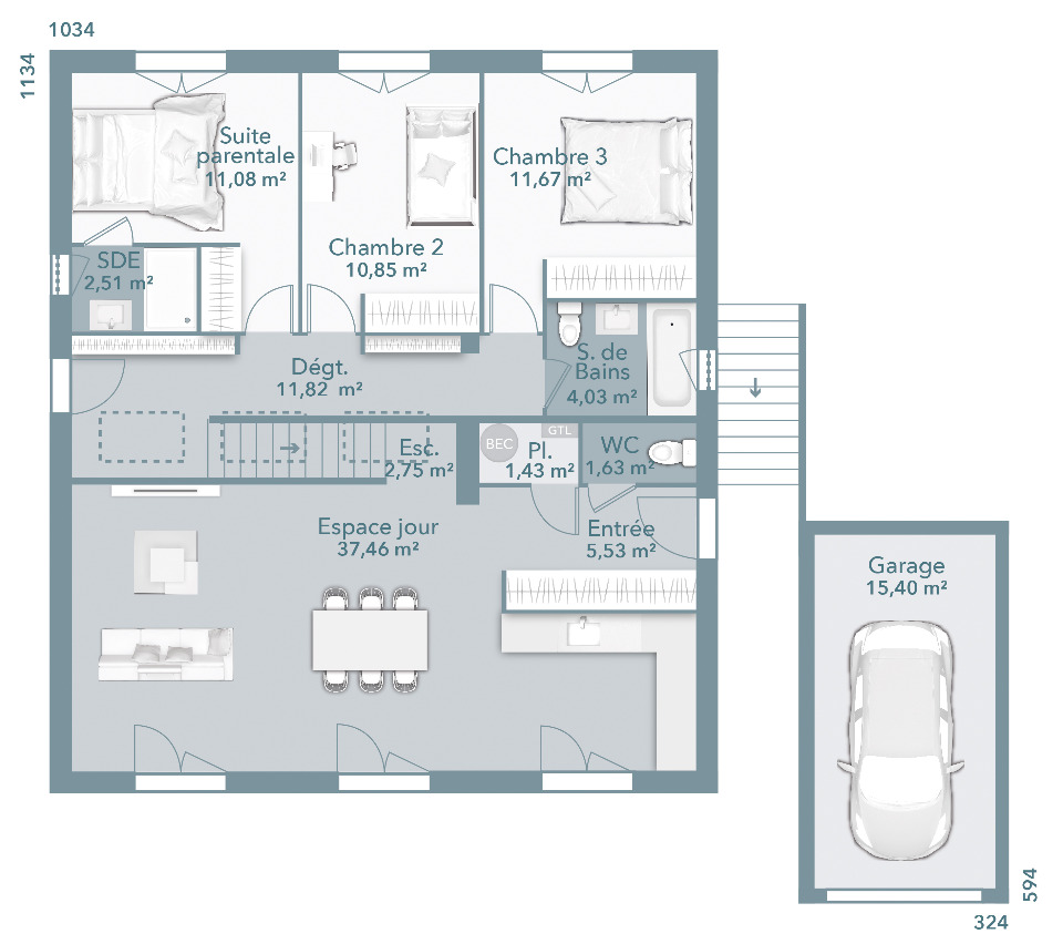 Votre maison bioclimatique est livrée crépis gratté + carrelage dans toutes les pièces (A choisir). Dans la salle de bain la faïence est comprise (A choisir). Les sanitaires avec meuble vasque et wc suspendu sont déjà inclus. Tous les volets sont motorisés