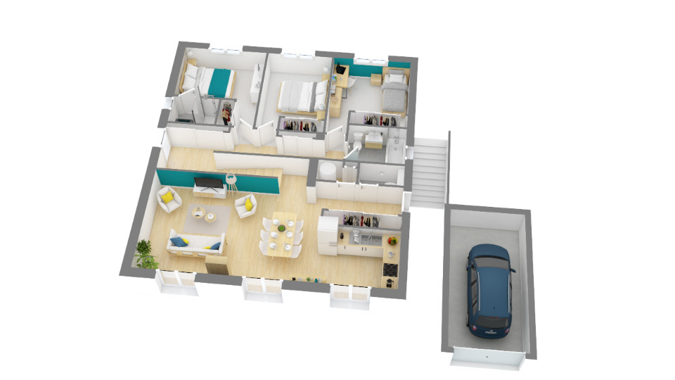 Son intérieur compte trois chambres, une salle de bains ainsi qu'un séjour salon cuisine très lumineux EN NIVEAUX DECALE ouvert sur votre jardin et pouvant accueillir un îlot central.
