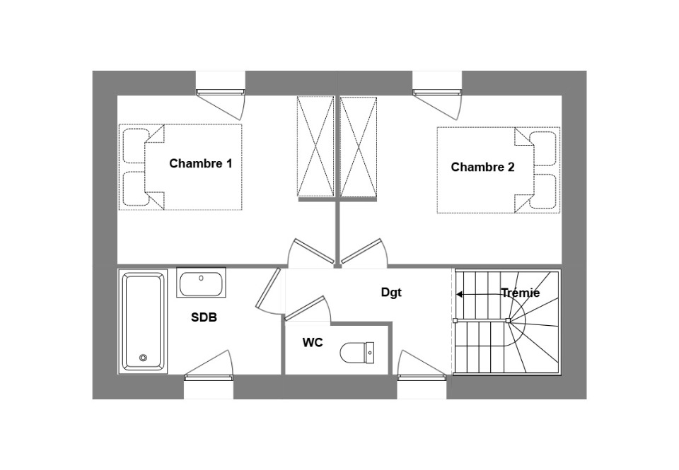 C'est une maison de 2 niveaux. Elle inclut deux chambres, une cuisine et une salle de bains. La maison est neuve.