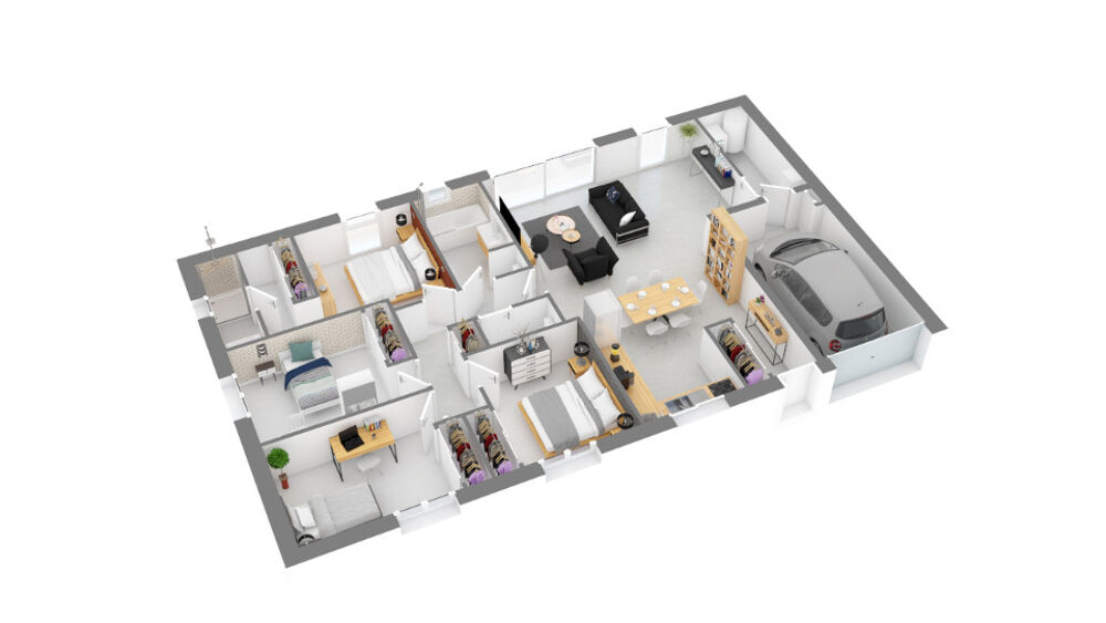 Faites le choix d'une maison fonctionnelle et optimisée : une grande pièce de vie de 38 m², un cellier, 4 chambres, une salle de bains et une suite parentale avec salle d'eau privative et dressing, le tout de plain-pied, avec un garage intégré et dans un style mêlant parfaitement simplicité et modernité.