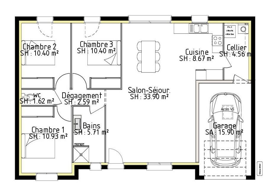 Cette maison de plain-pied de 88m² offre un espace de vie optimisé et lumineux. Elle comprend un grand salon-séjour traversant de 43m², dont une cuisine avec cellier de 4,5m², ainsi que trois chambres spacieuses. Le garage de 15m², pratique et fonctionnel, complète ce bien. Une salle d'eau moderne et un WC indépendant viennent parfaire l'agencement. Idéale pour une famille, cette maison allie confort, fonctionnalité et espace.Nos offres de terrains sont proposées en collaboration avec nos partenaires fonciers pour des maisons dans le cadre de la loi du 10/12/1990, selon disponibilité.