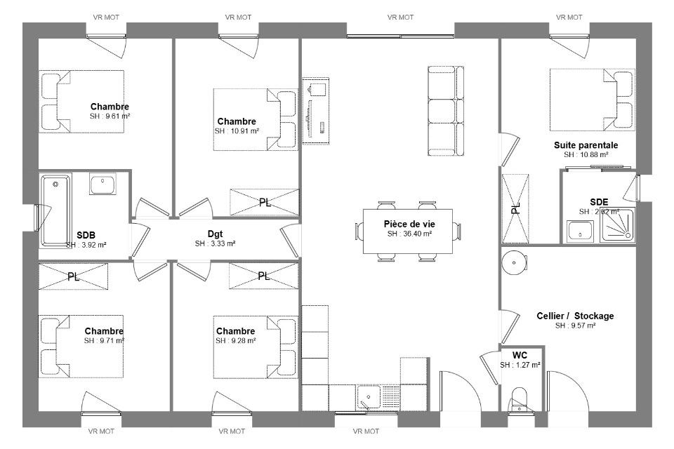 Voici une belle maison de 107m² à construire, comprenant 5 chambres, dont une suite parentale confortable. Elle dispose de 2 salles de bain modernes pour un confort optimal. Un grand cellier est également prévu, idéal pour le stockage et l'organisation.Cette maison est entièrement personnalisable selon vos envies et besoins.