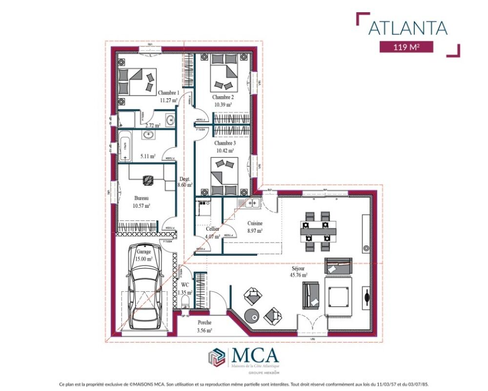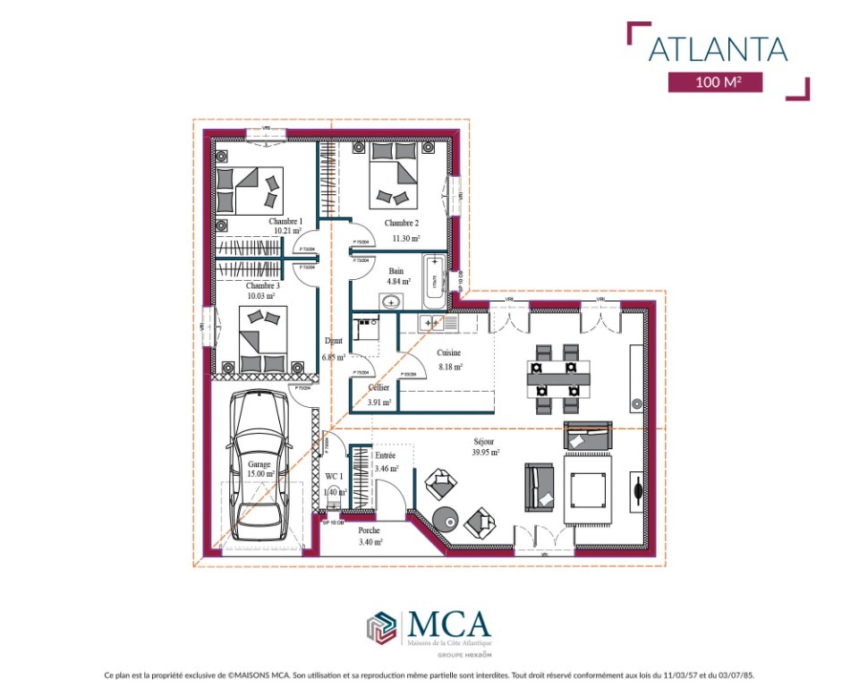 Nathalie PENICAUT des maisons MCA Soustons, vous propose d'adapter le modèle Atlanta, sur ce beau terrain d'environ 570m2, idéalement situé sur la commune de Moliets et Maa.Cette maison familiale en L avec garage, dispose d'un hall d'entrée avec placard, un magnifique séjour lumineux donnant sur le jardin, et une cuisine ouverte pour un espace de vie de plus de 52m2. L'espace nuit est composé de 3 chambres avec placards, une salle de bains avec double vasques, et une suite parentale avec salle d'eau. Un double garage de 27m2 avec cellier communiquant viennent compléter ce bel ensemble.