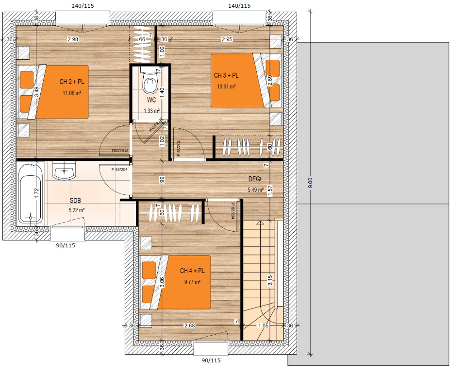 VENTE d'une maison de 5 pièces (102 m²) à TiercéProche d'Angers - À Tiercé (49125), maison neuve en vente de 5 pièces, 2 niveaux, 102 m² de surface sur 600 m² de terrain. Elle est composée de quatre chambres, d'une cuisine et de deux salles de bains.