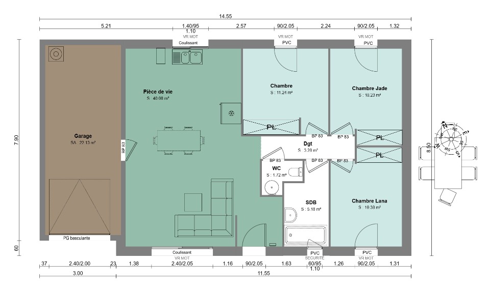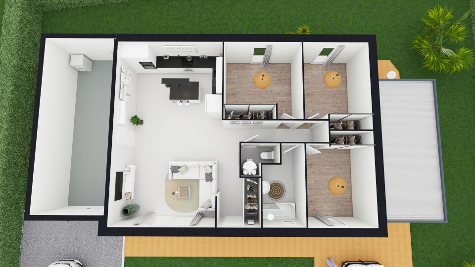 Cette maison comprend 3 chambres, un espace de vie cuisine/séjour ouvert, un garage et une salle d'eau commune, les menuiseries sont en pvc, et le système de chauffage est une Pac Air Air..