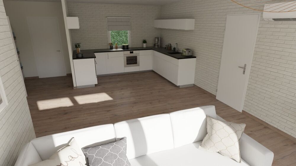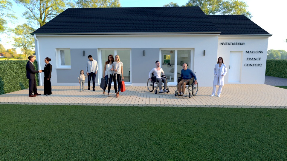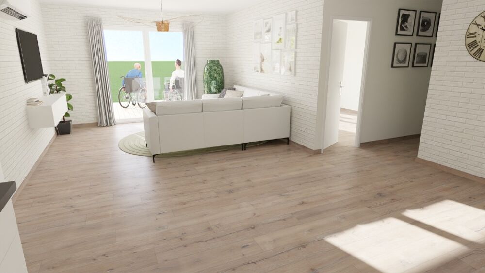 Cette maison conforme aux normes pmr, comprend 3 chambres, un espace de vie cuisine/séjour ouvert de 37 m², un grand garage et une salle d'eau commune, les menuiseries sont en pvc, et le système de chauffage est une Pac Air Air..