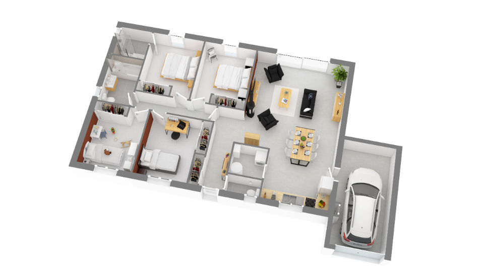 Elle offre trois chambres, une cuisine avec grand séjour, deux salles de bains et un garage en option.