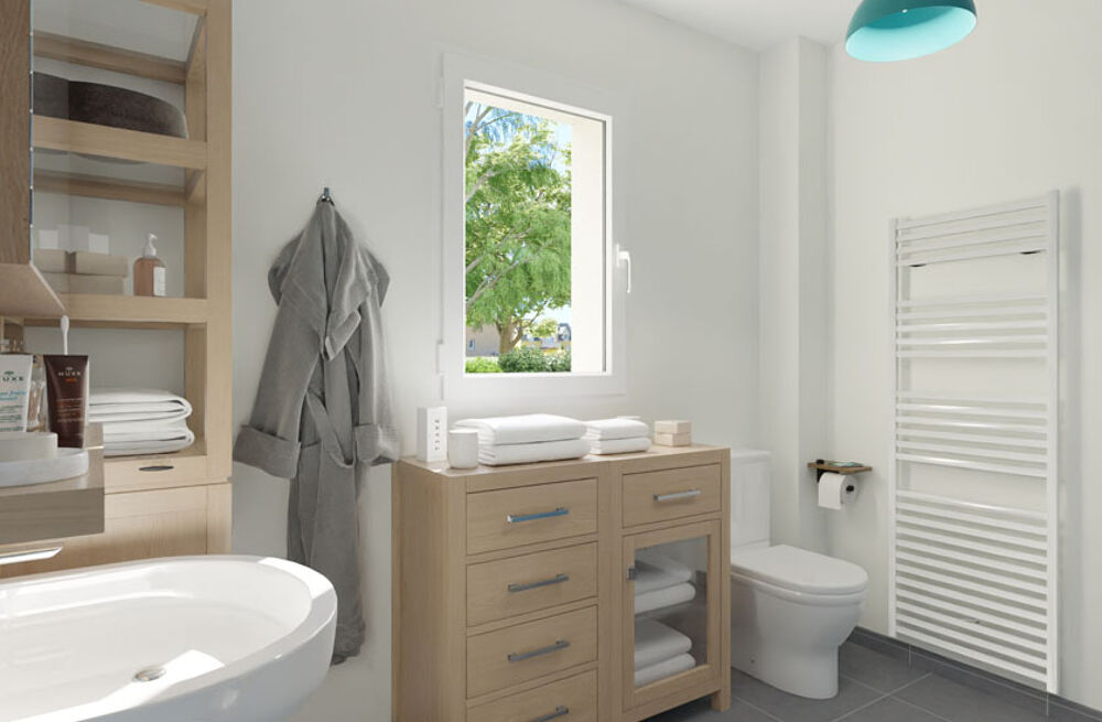 Cette maison de plain-pied d'une surface habitable de 62 m² propose une façade de 11,5 m linéaire et est construite sur vide sanitaire. Elle comprend 2 chambres de plus de 9 m² avec un espace de rangement, un séjour cuisine de plus de 31 m², une salle d'eau avec un WC et un garage intégré de 14 m². A noter, le garage est compatible avec un futur aménagement intérieur (hors point d'eau). Les menuiseries sont en PVC de couleur blanche, les volets sont quant à eux en bois prépeints en blanc. Plusieurs couleurs d'enduit extérieur sont proposées.