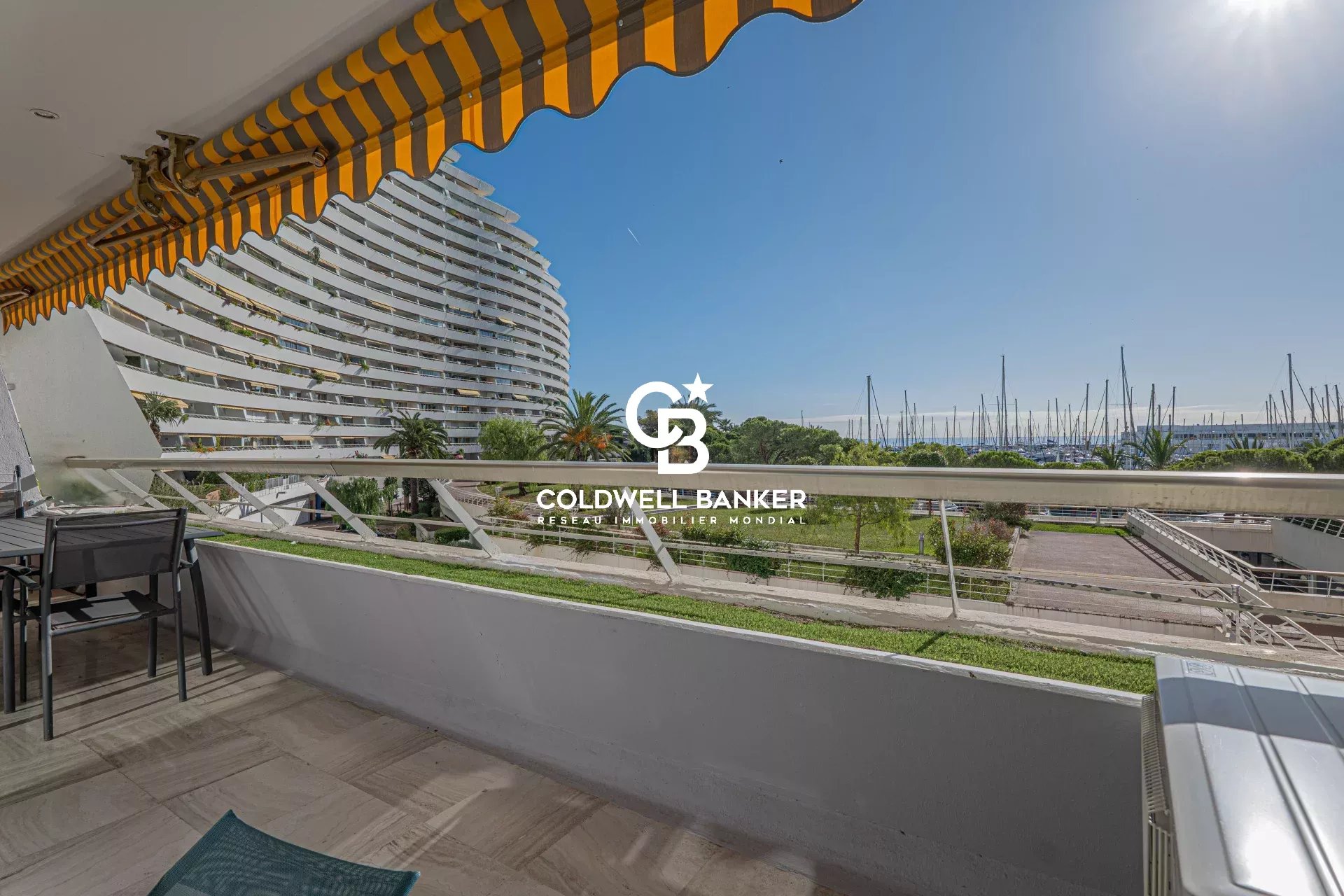 La terrasse de 13 m² offre un panorama exceptionnel à 180° sur la mer, le port et les lignes architecturales emblématiques de Marina Baie des Anges.
