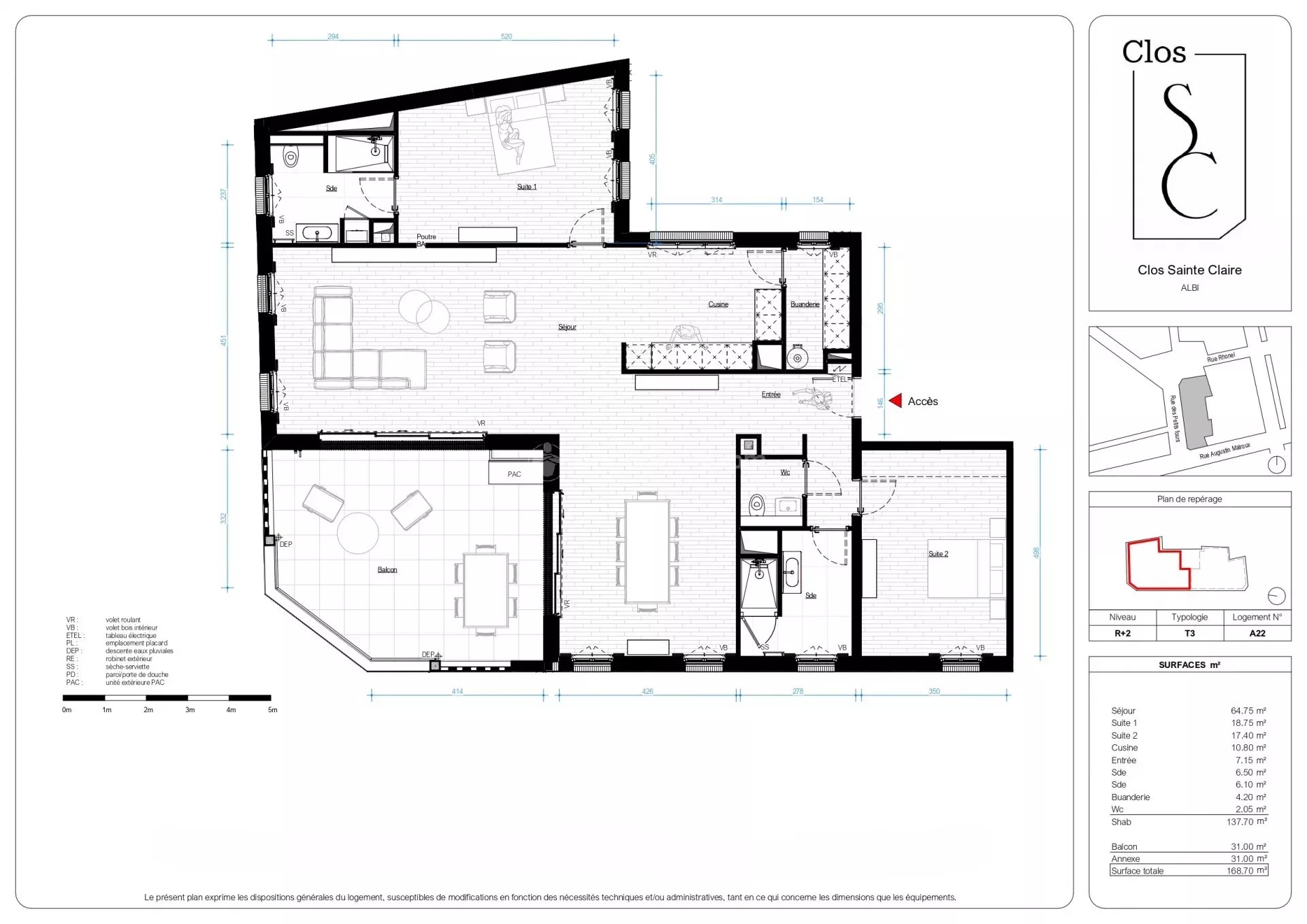 Hyper centre-ville d'Albi : Appartement T3 de standing d'environ 137.70 m² au 2? étage avec ascenseur dans une résidence neuve à deux pas des rues piétonnes.