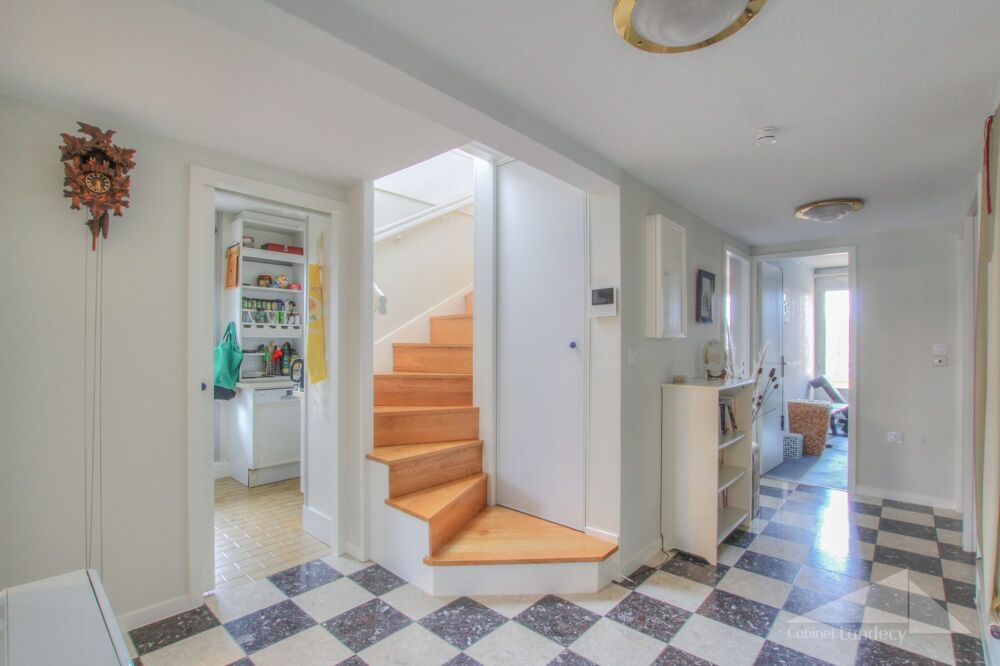 À l'étage, une grande suite parentale avec salle d'eau, WC et accès à une superbe terrasse de 44 m² offrant une vue dégagée sur le Jura.