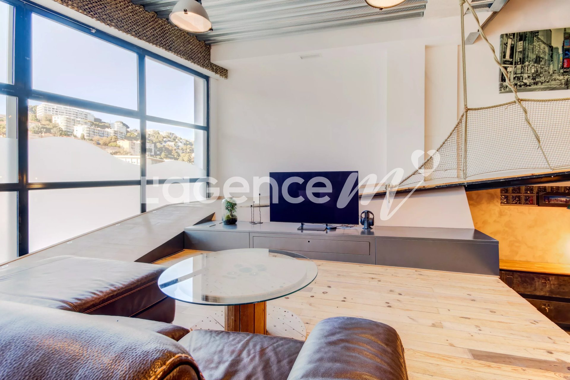 La pièce principale vous offre un espace à vivre assez incroyable de presque 110 m2 avec différents niveaux pour différentes ambiances : un espace salon / lounge des plus cosy devant une grande baie vitrée, un espace salle à manger, bar et bureau en contre-bas de l'escalier flottant du plus bel effet.