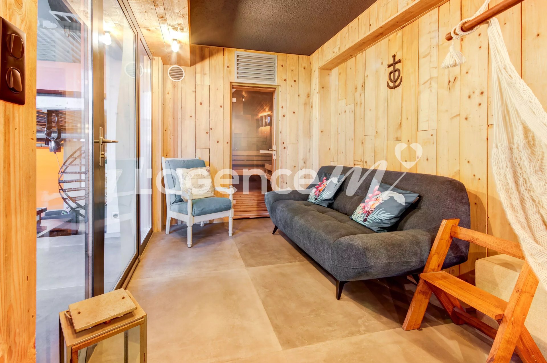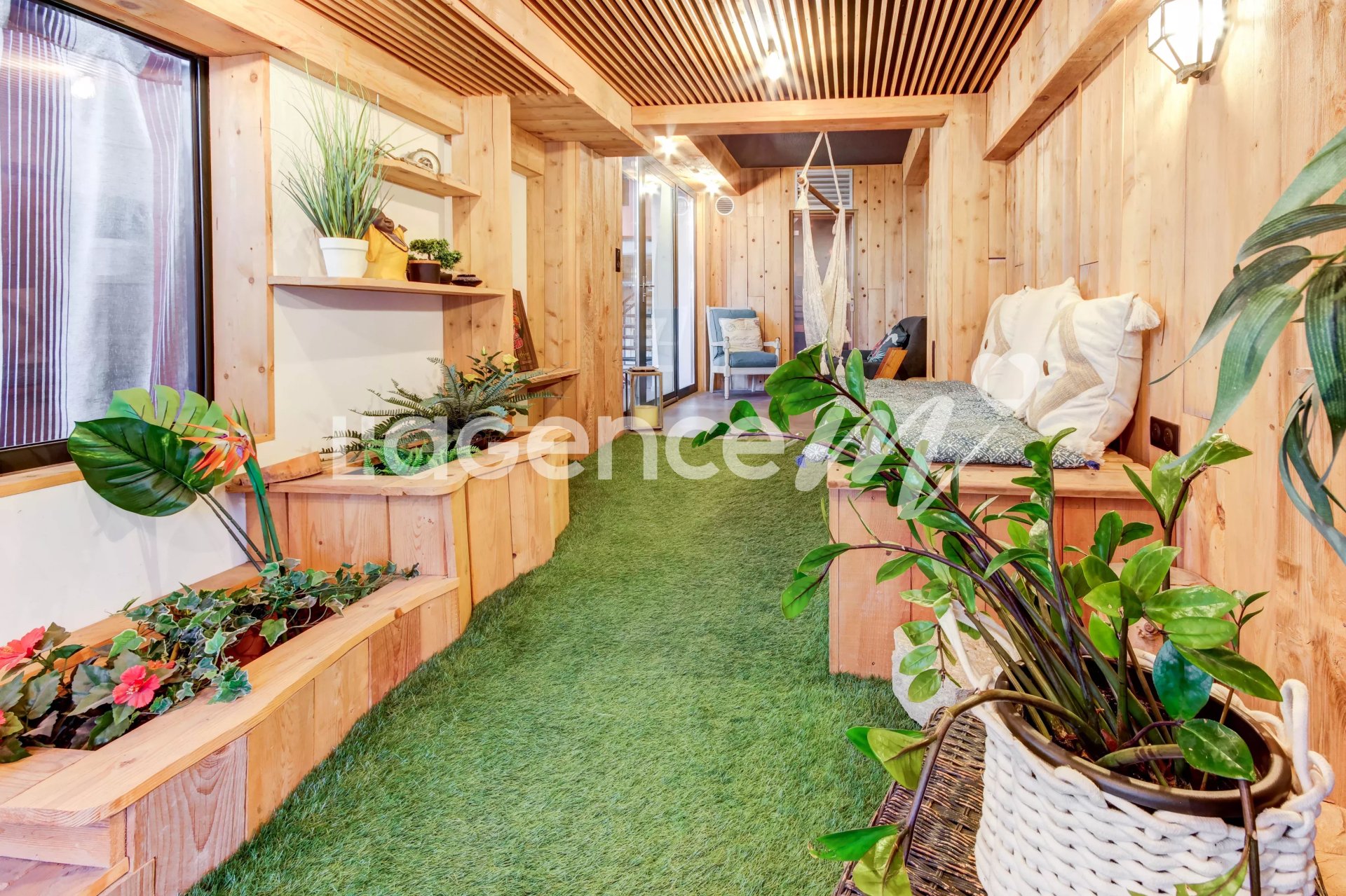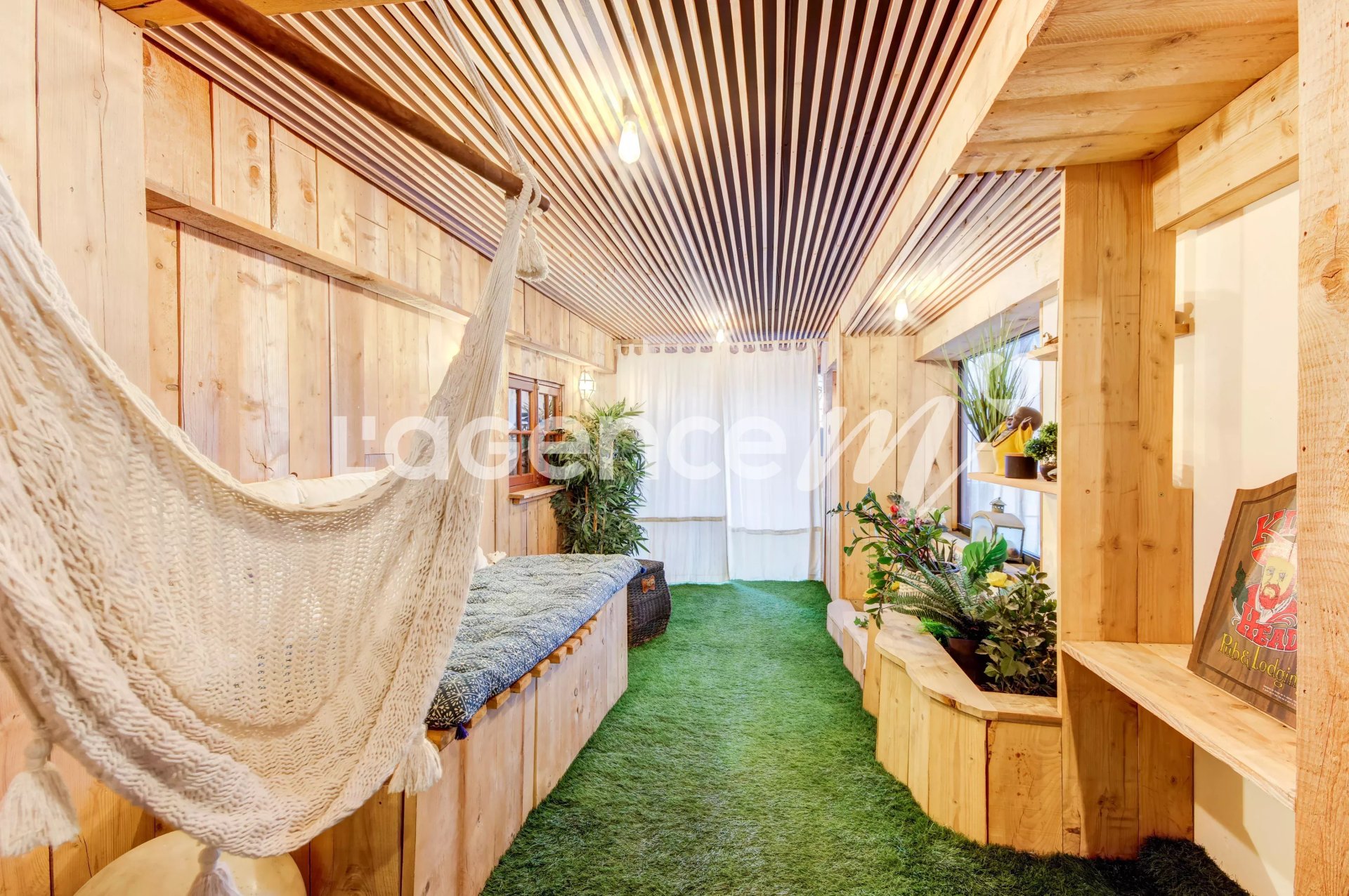 Conçu comme un espace détente et Feng shui, propice au yoga ou toute autre activité de votre goût, un chill-bench vous accueillera avec son bois d'essence issu de l'ancien sauna pour profiter de vos meilleures lectures.