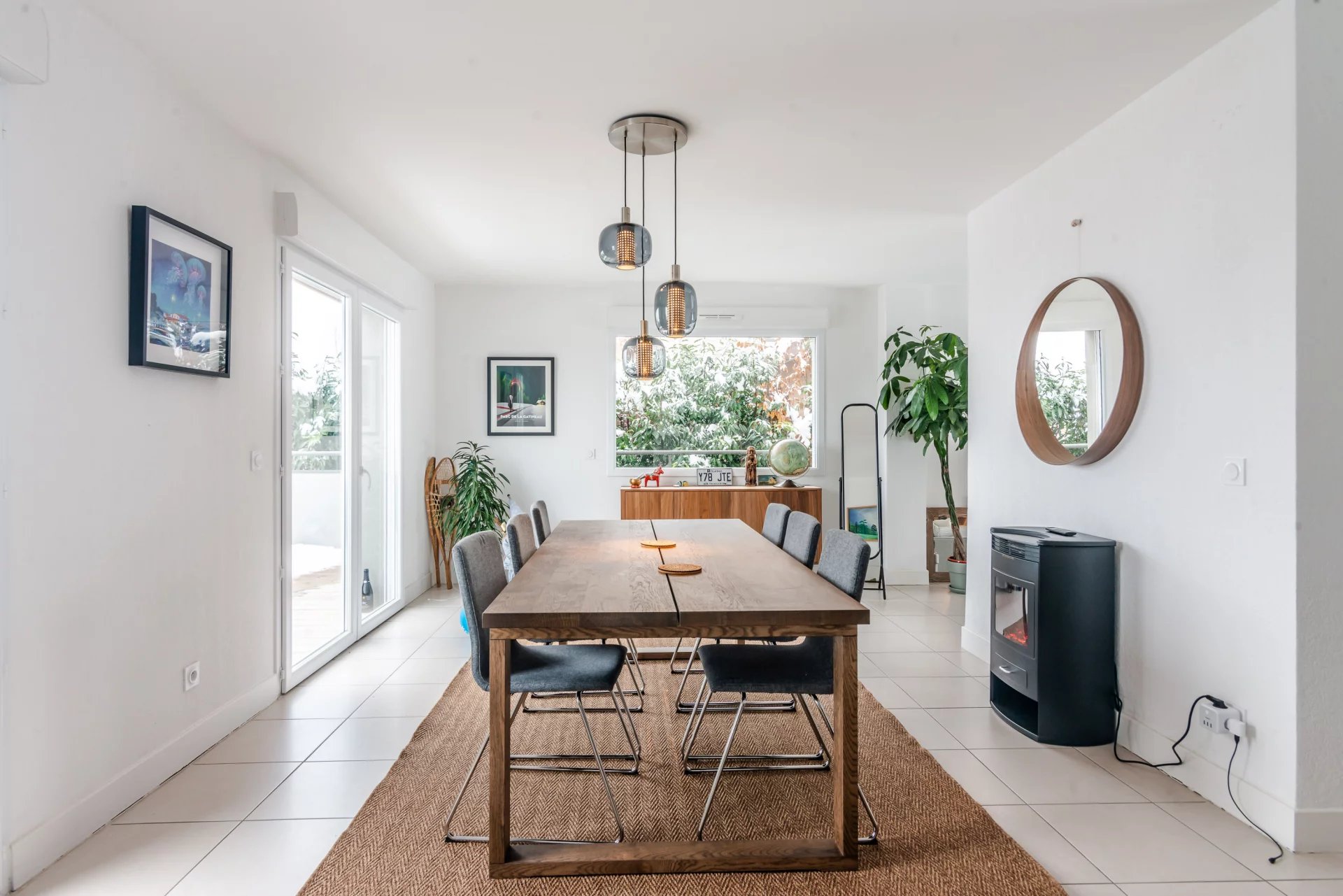 - un grand séjour salon avec cheminée donnant sur un jardin Sud et une terrasse avec vue panoramique sur le Lac.