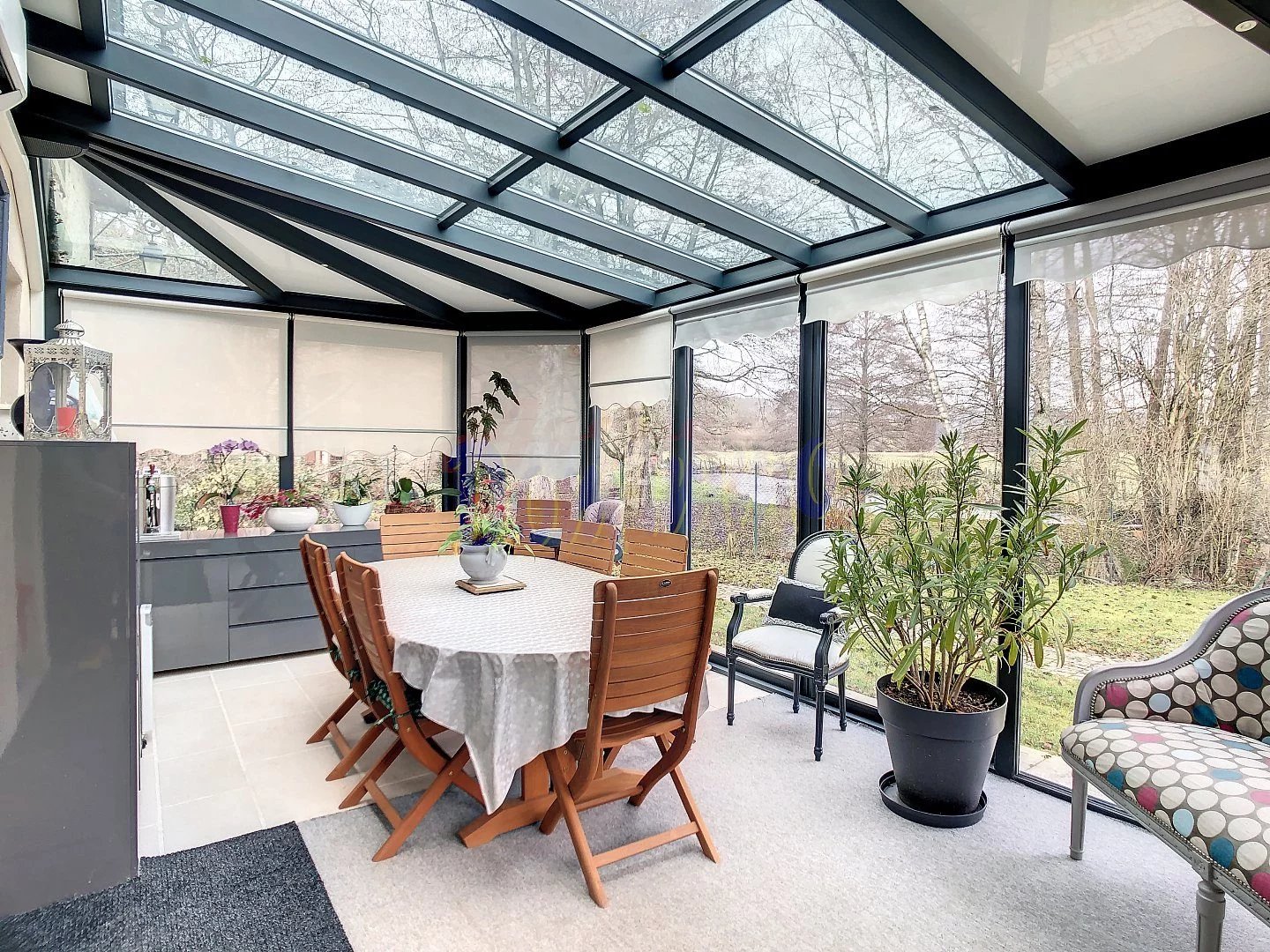 La véranda climatisée, offrant une vue imprenable sur la campagne environnante et la rivière, est un espace de vie supplémentaire idéal pour profiter des saisons.