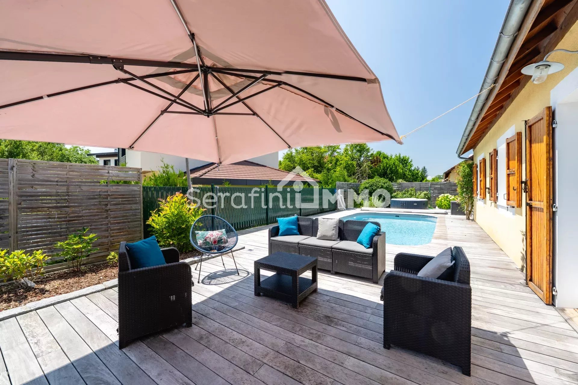L'extérieur avec piscine et un système d'éclairage qui sublime les soirées d'été.