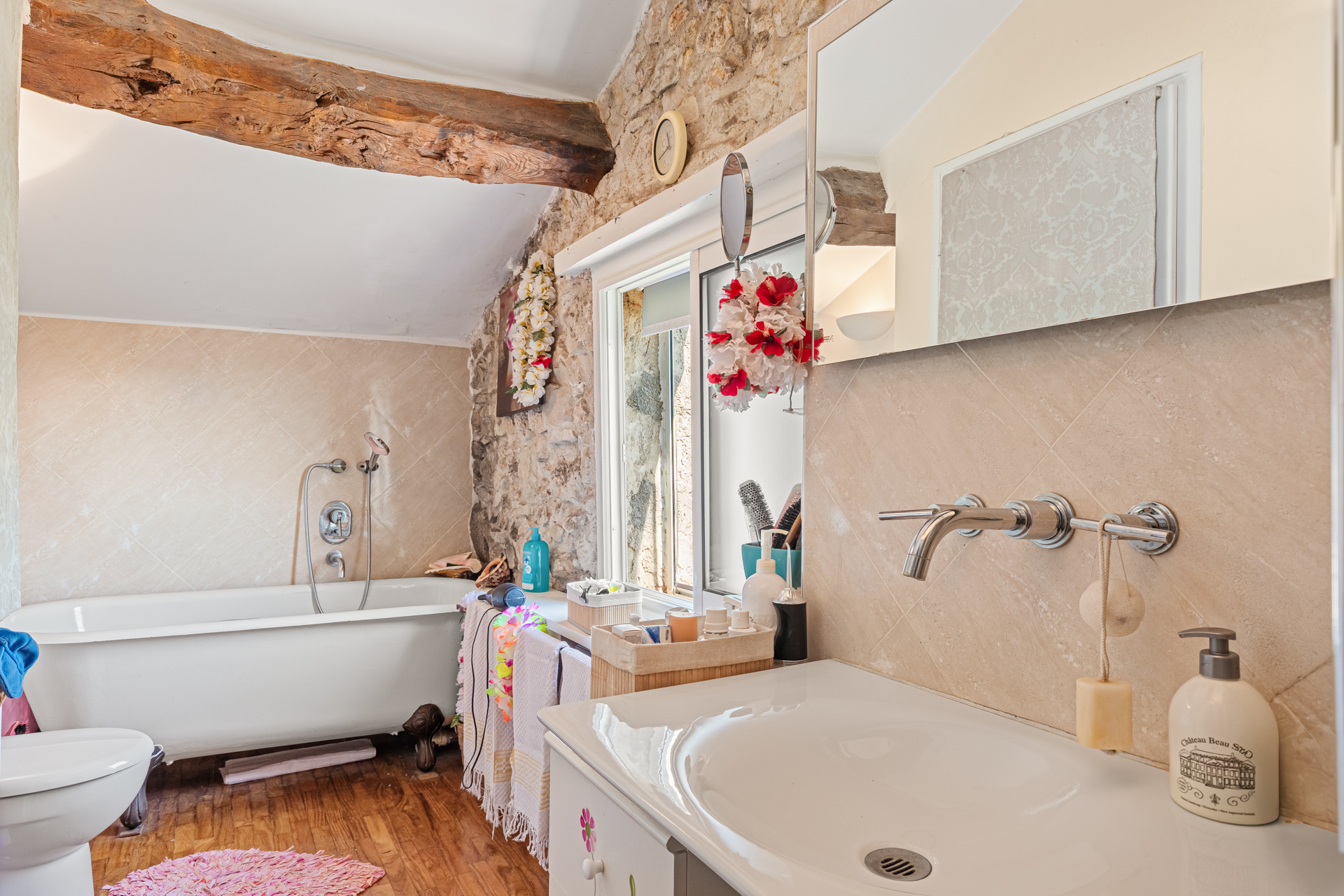 Un vaste séjour lumineux aux poutres apparentes et murs en pierre, où chaque détail raconte une histoire.