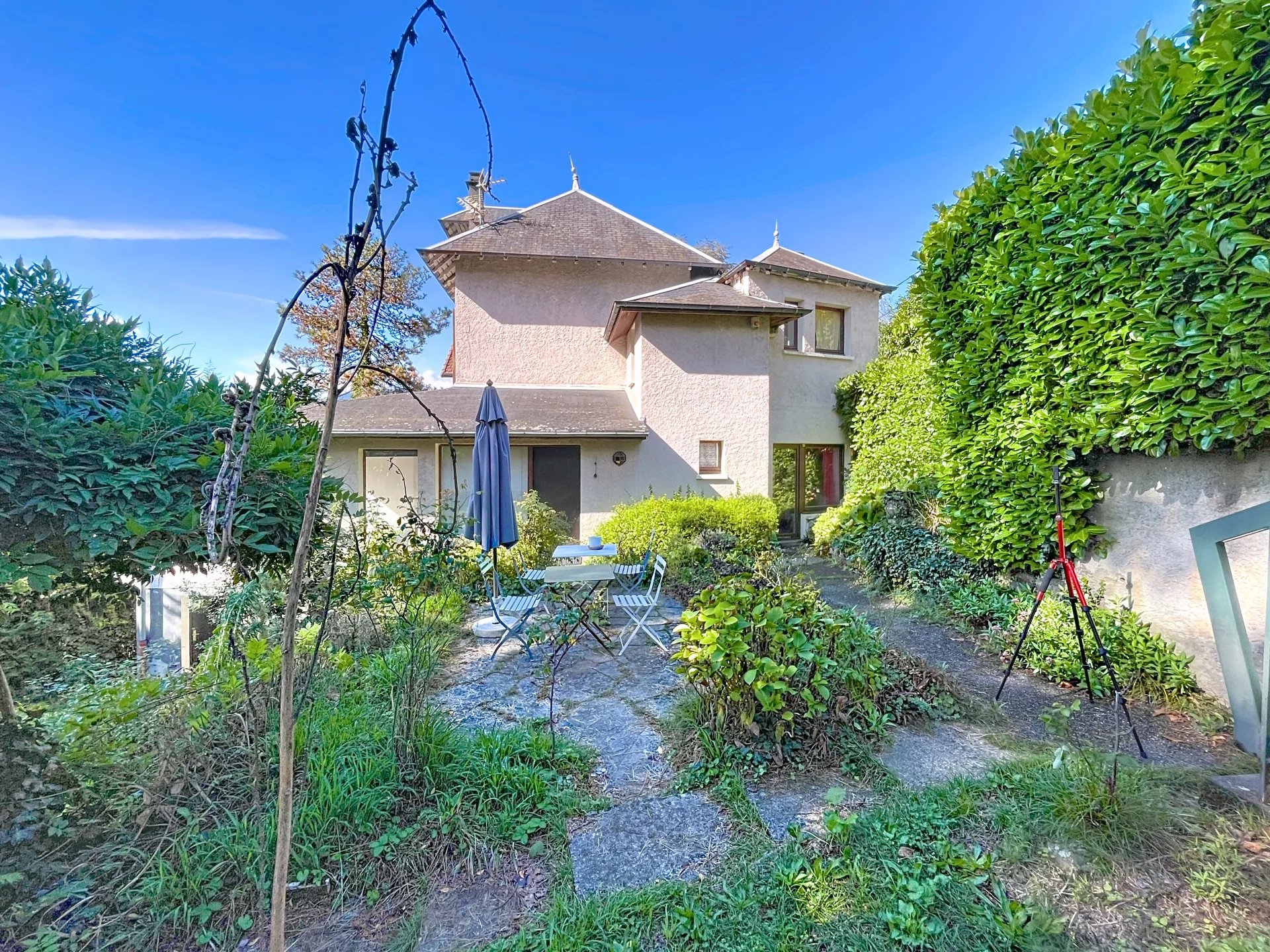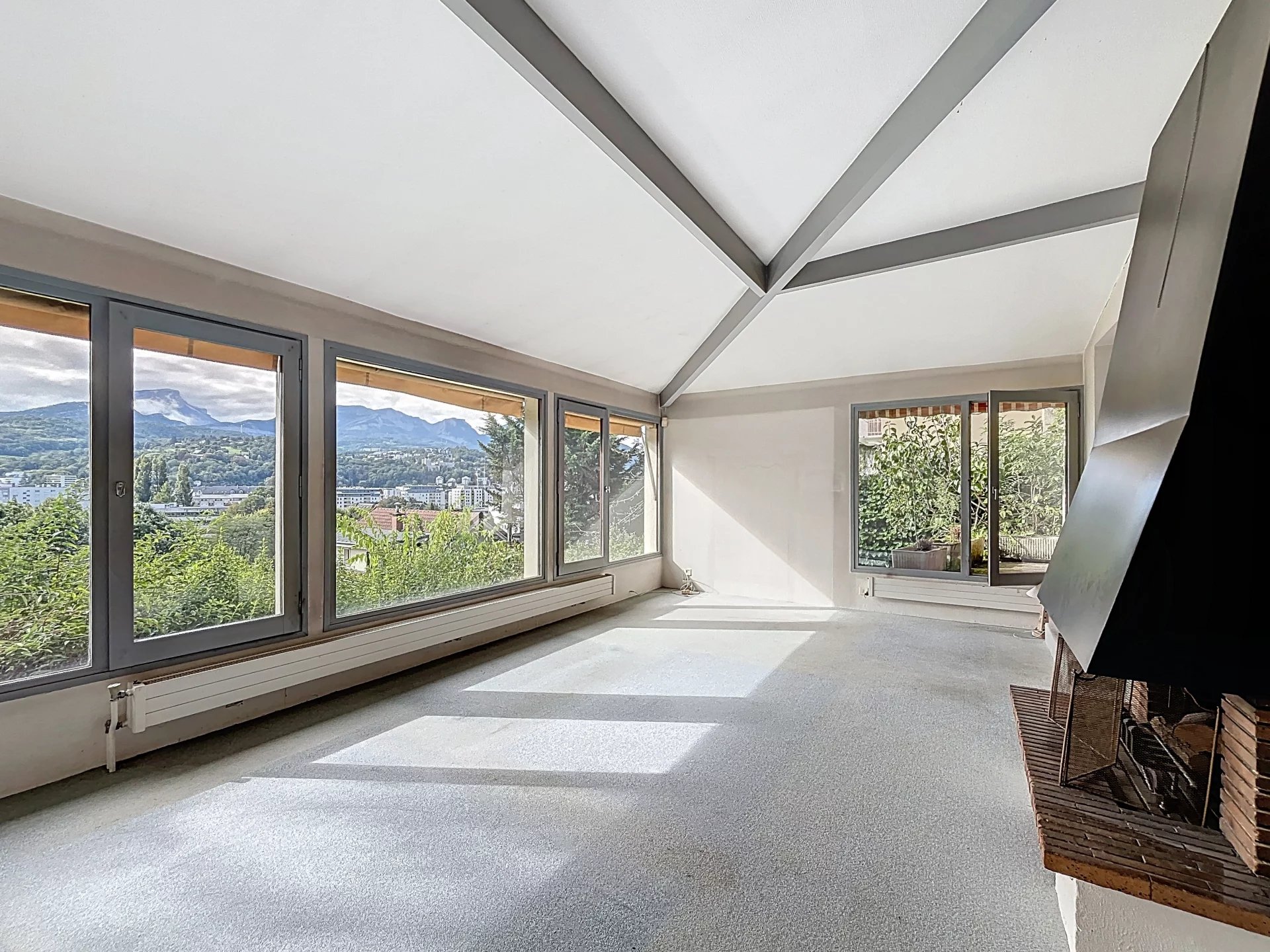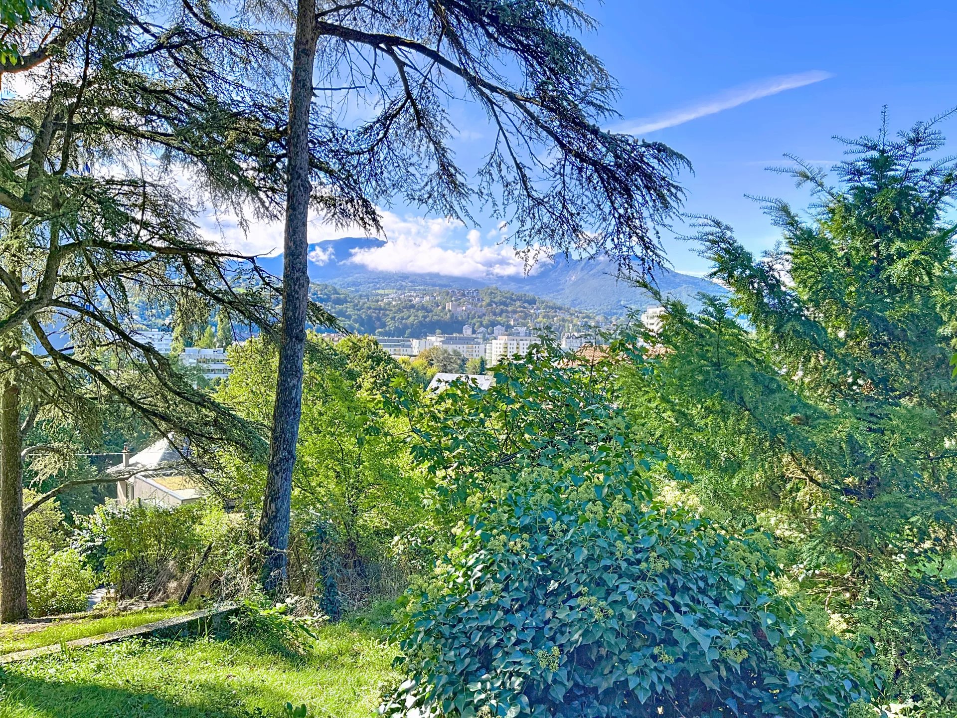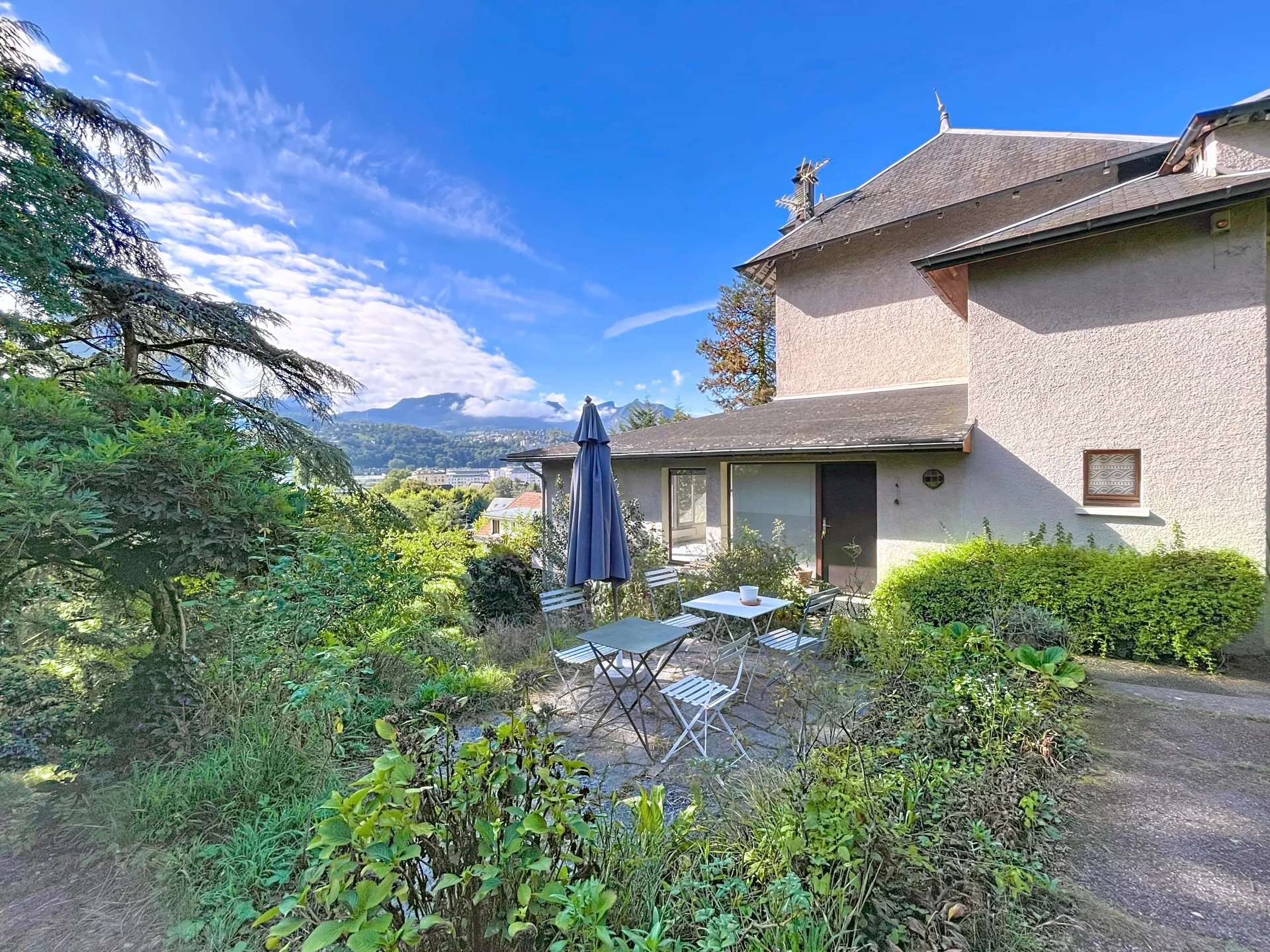 Cette maison se compose de, au rez-de-chaussée une belle entrée avec rangement , un WC avec point d'eau, un salon/ séjour très lumineux sur demi niveau avec une cheminée centrale offrant une superbe vue panoramique sur Chambéry et les montagnes, une cuisine conviviale s'ouvre sur une vaste terrasse et jardin arboré, idéal pour profiter des beaux jours.