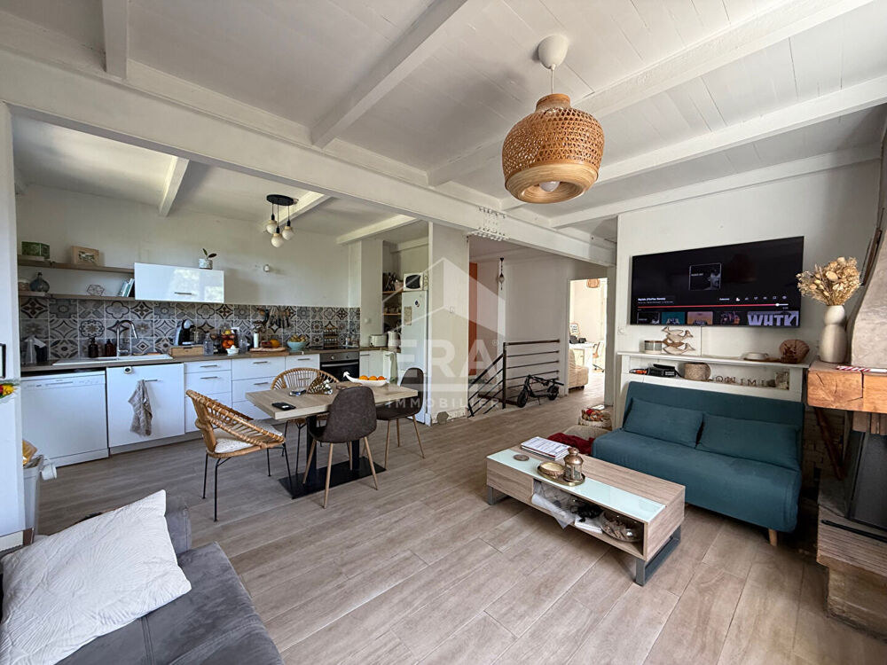 Située dans un environnement paisible à quelques minutes à pied du coeur du village, cette maison datant des années 60 a bénéficié d'une rénovation intérieure importante. Au premier niveau vous découvrirez une pièce de vie lumineuse avec cuisine ouverte, ainsi que deux chambres confortables. Le niveau inférieur propose un vaste espace d'environ 45 m² à finir de personnaliser selon vos envies (atelier, salle de jeux, bureau, chambre, etc.), ainsi qu'une salle de bain équipée d'une baignoire et d'une douche, et de toilettes séparées. Le bien profite d'une belle exposition, de double vitrage, d'une climatisation réversible dans les pièces principales, et d'une cheminée à foyer ouvert. Il est raccordé au réseau d'assainissement collectif. Le terrain quant à lui offre plusieurs espaces de détente et un espace de stationnement, quelques finitions extérieures restent à prévoir. Venez découvrir ce joli produit au calme, à deux pas de toutes les commodités. Ne laissez pas passer cette opportunité unique !
