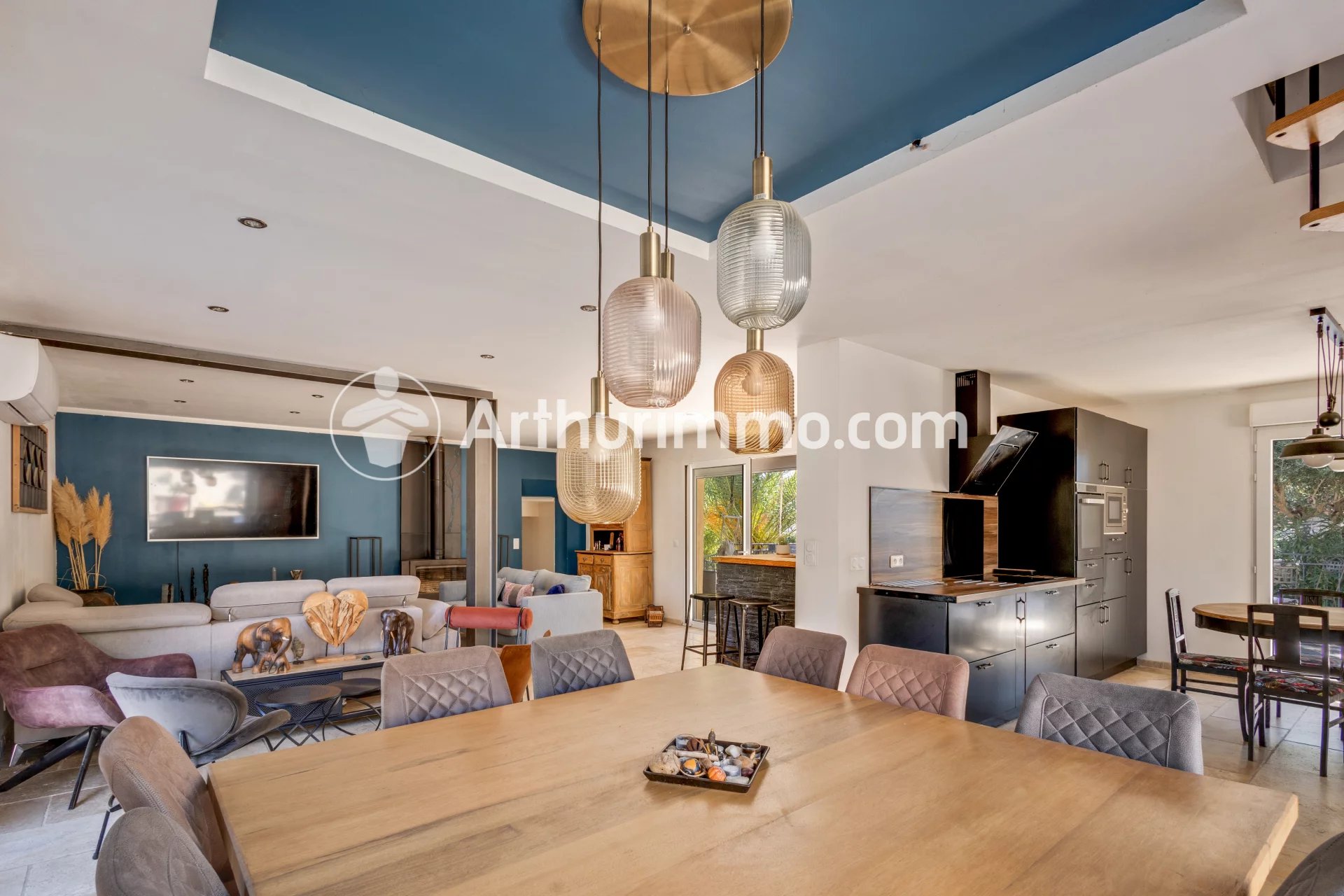 La cuisine ouverte, aménagée et équipée, s'intègre harmonieusement à l'espace de réception.