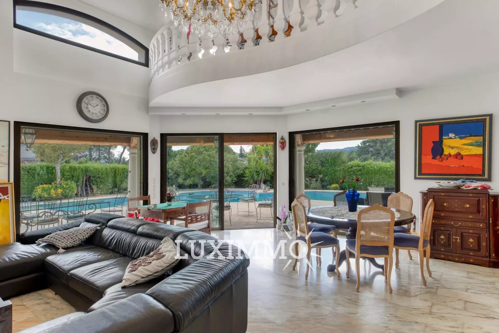 Au rez-de-jardin : Un large salon-séjour avec hauteur cathédrale, une cuisine séparée équipée, ouvert sur la terrasse et l'espace piscine.
