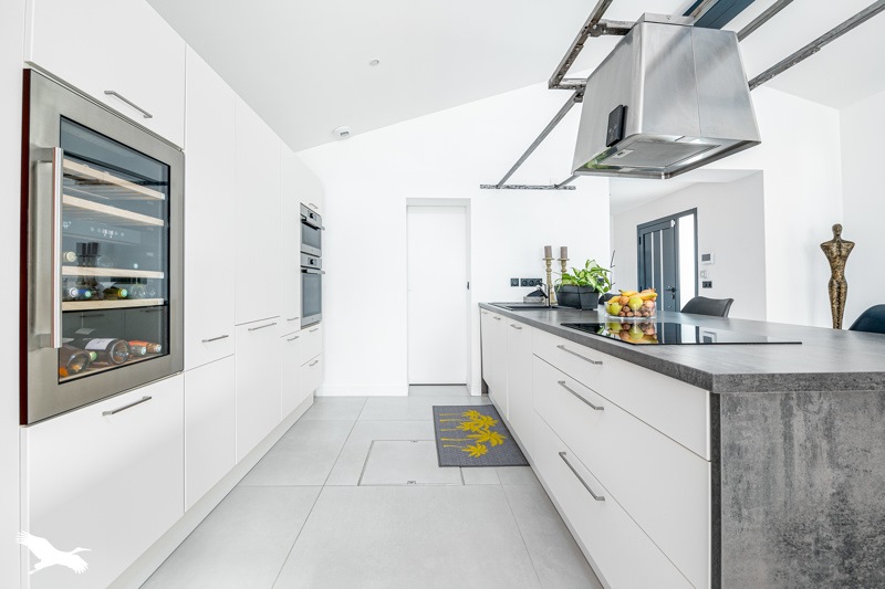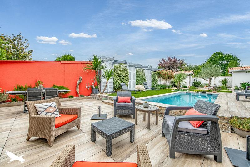 Pièce de vie de plus de 50 m², avec cuisine équipée, donnant sur une terrasse de 150 m² plein sud sans vis-à-vis entourant une piscine de 3 x 7 m.