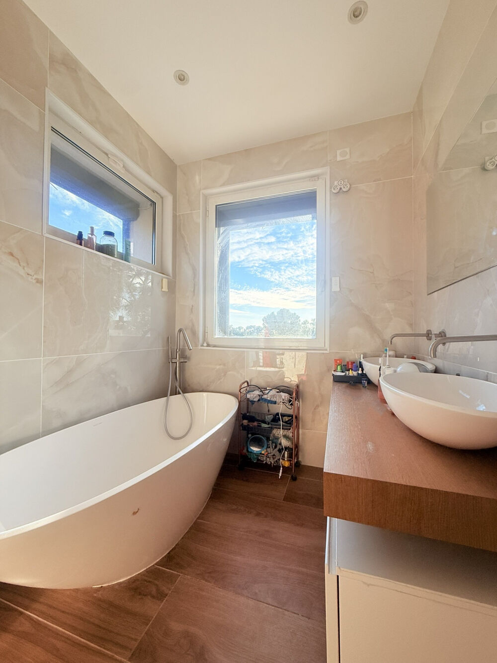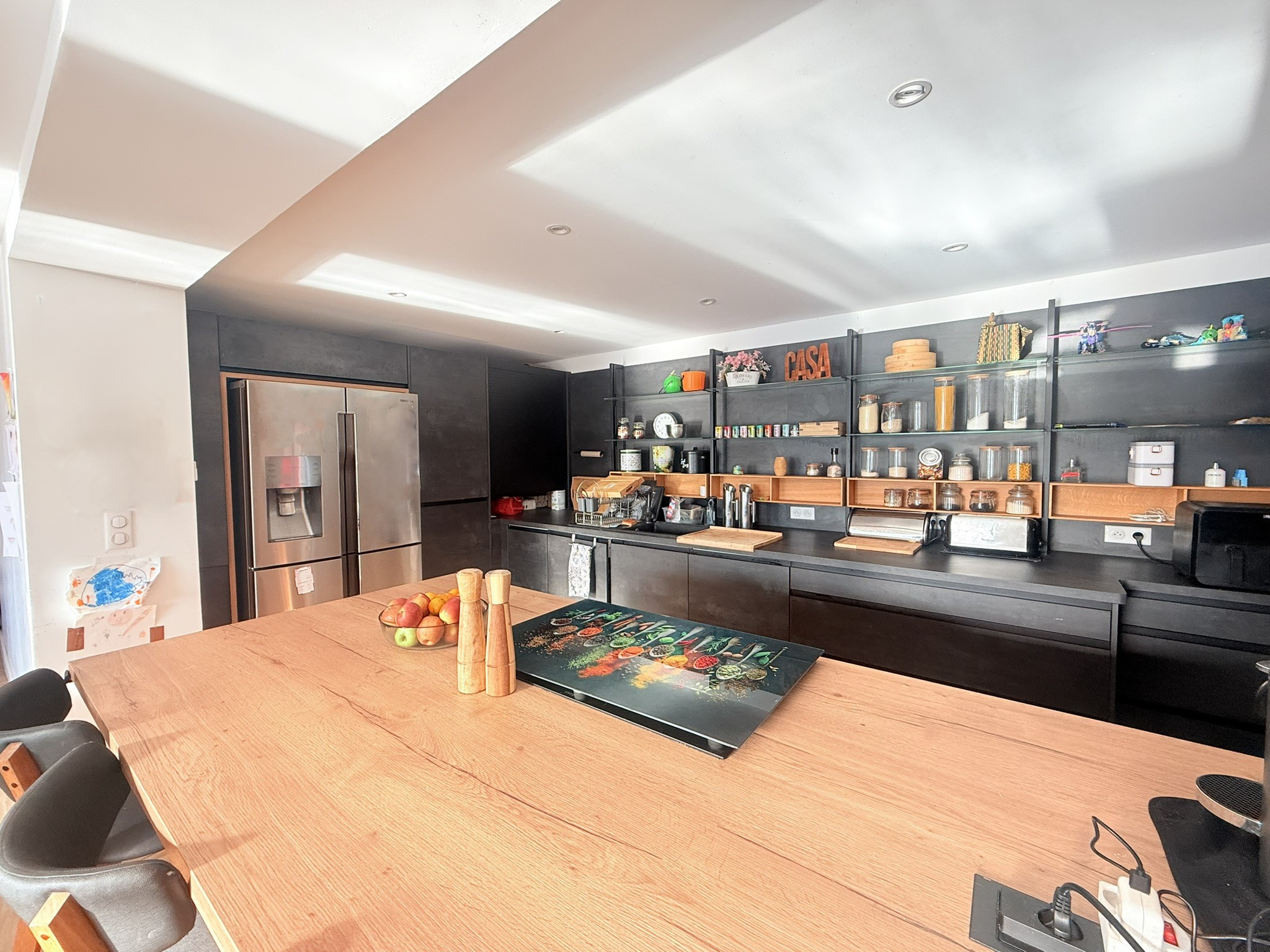 Au rez-de-jardin, un bel espace cuisine ouvert sur une pièce de vie avec vue sur la piscine. Une quatrième chambre, également équipée de sa salle d'eau et son dressing complète ce niveau.