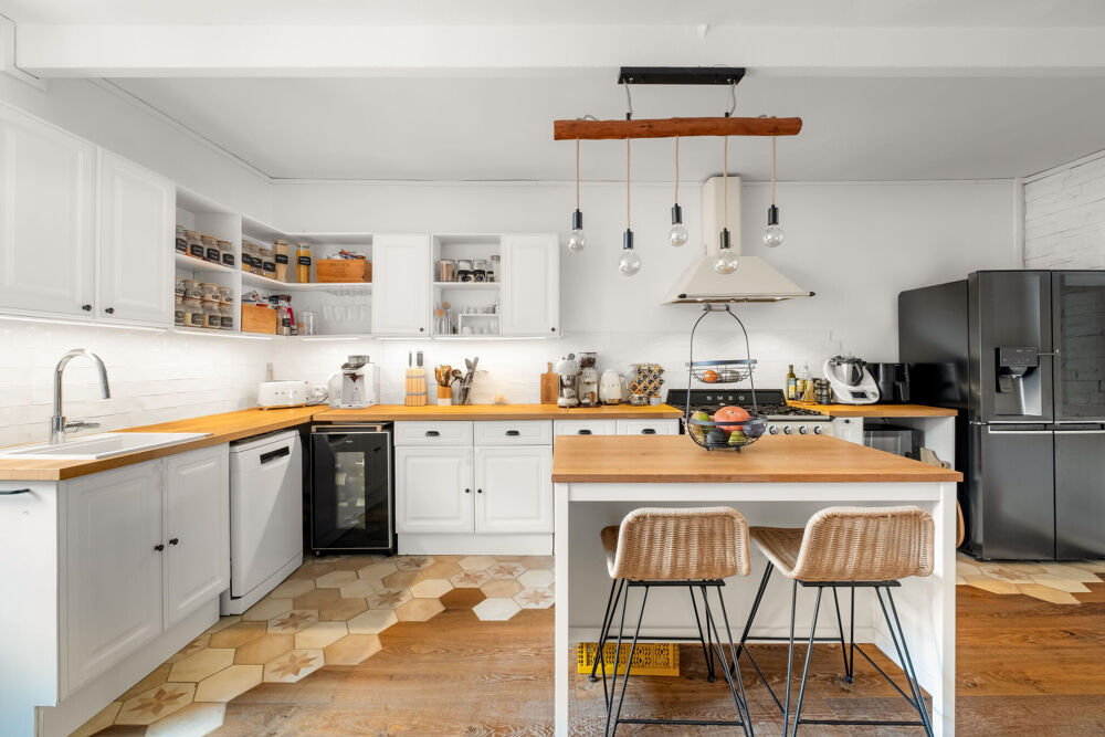 La cuisine s'ouvre sur une cour intérieure intimiste, sans aucun vis-à-vis, un cocon chaleureux qui mène ensuite vers un beau jardin avec piscine et vue sur le clocher.
