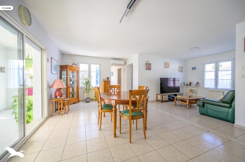 Maison familiale en parfait état offrant une pièce de vie lumineuse prolongée par une véranda ouvrant sur un jardin arboré, cuisine équipée et cellier.