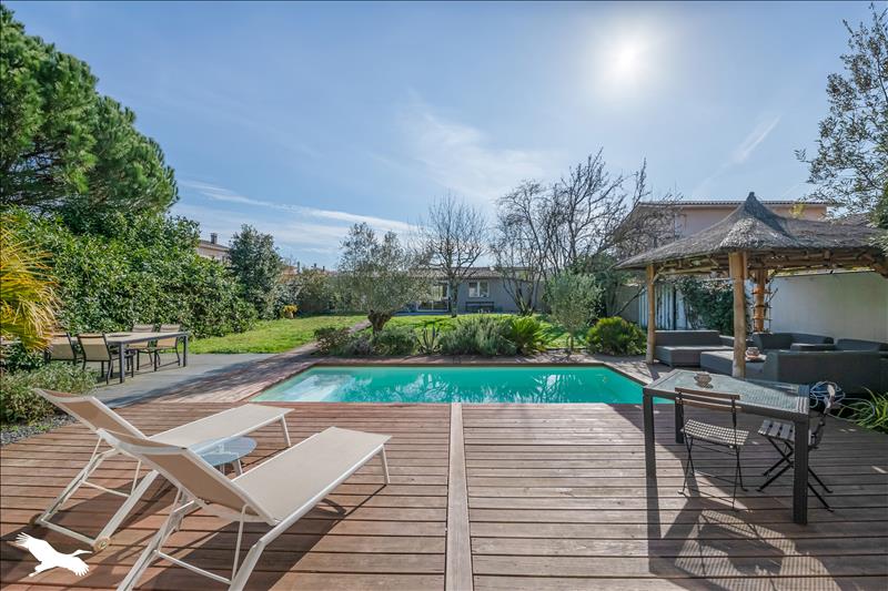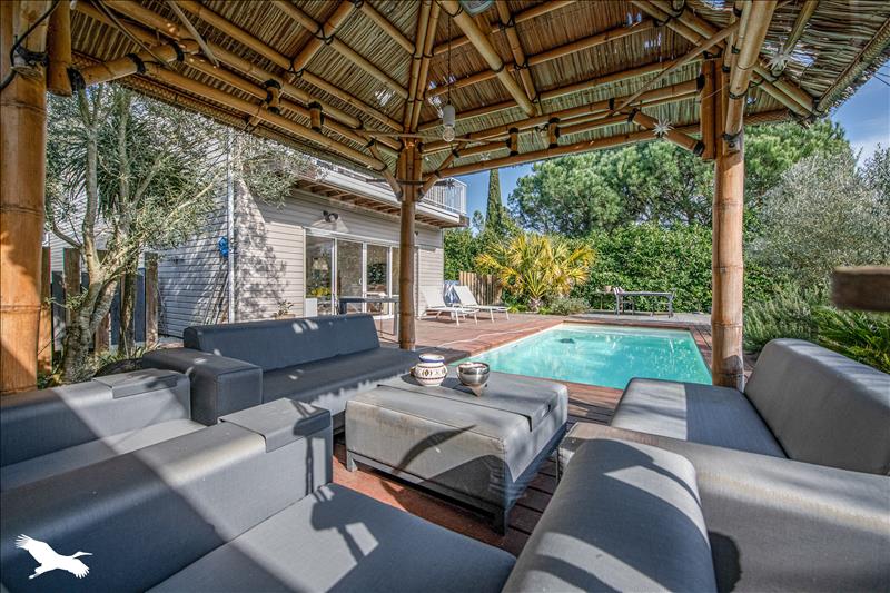 Suite parentale, dépendances idéales pour les adolescents ou invités, salle de sport, ainsi qu'un jardin paysagé avec piscine et paillote.