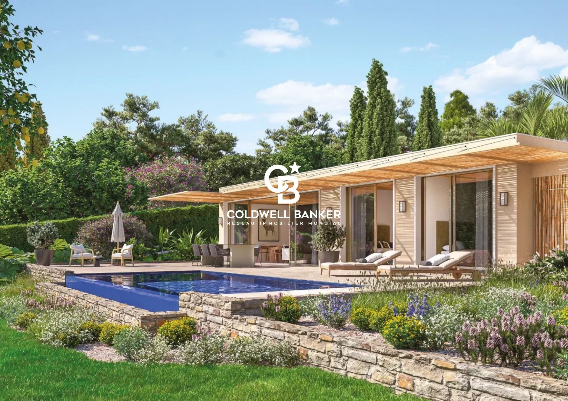 À l'extérieur, la villa se prolonge par un jardin paysager, une terrasse tournée vers l'horizon et une piscine invitant à la détente.