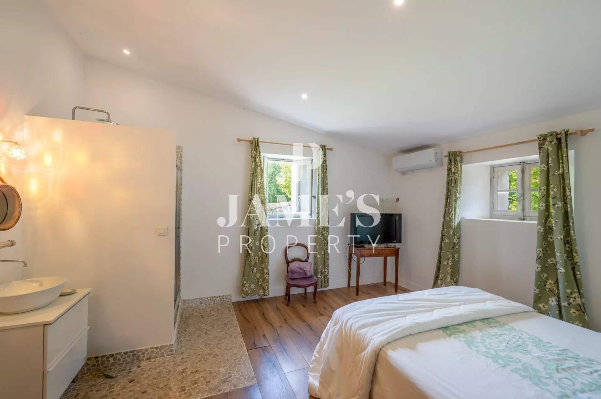 Le mas est doté d'un chauffage au sol sur les deux niveaux et d'un système de climatisation réversible, assurant un confort optimal en toute saison.