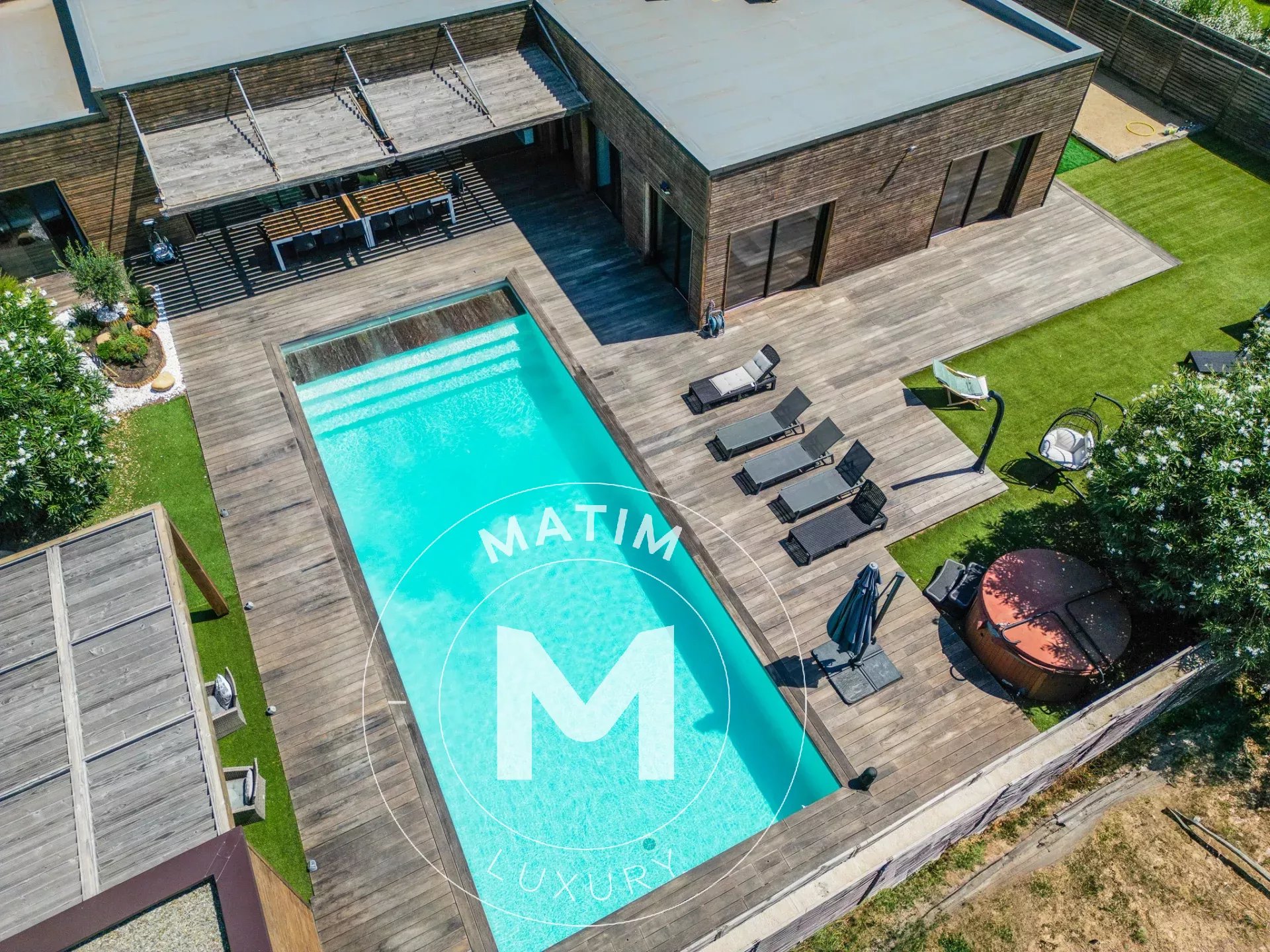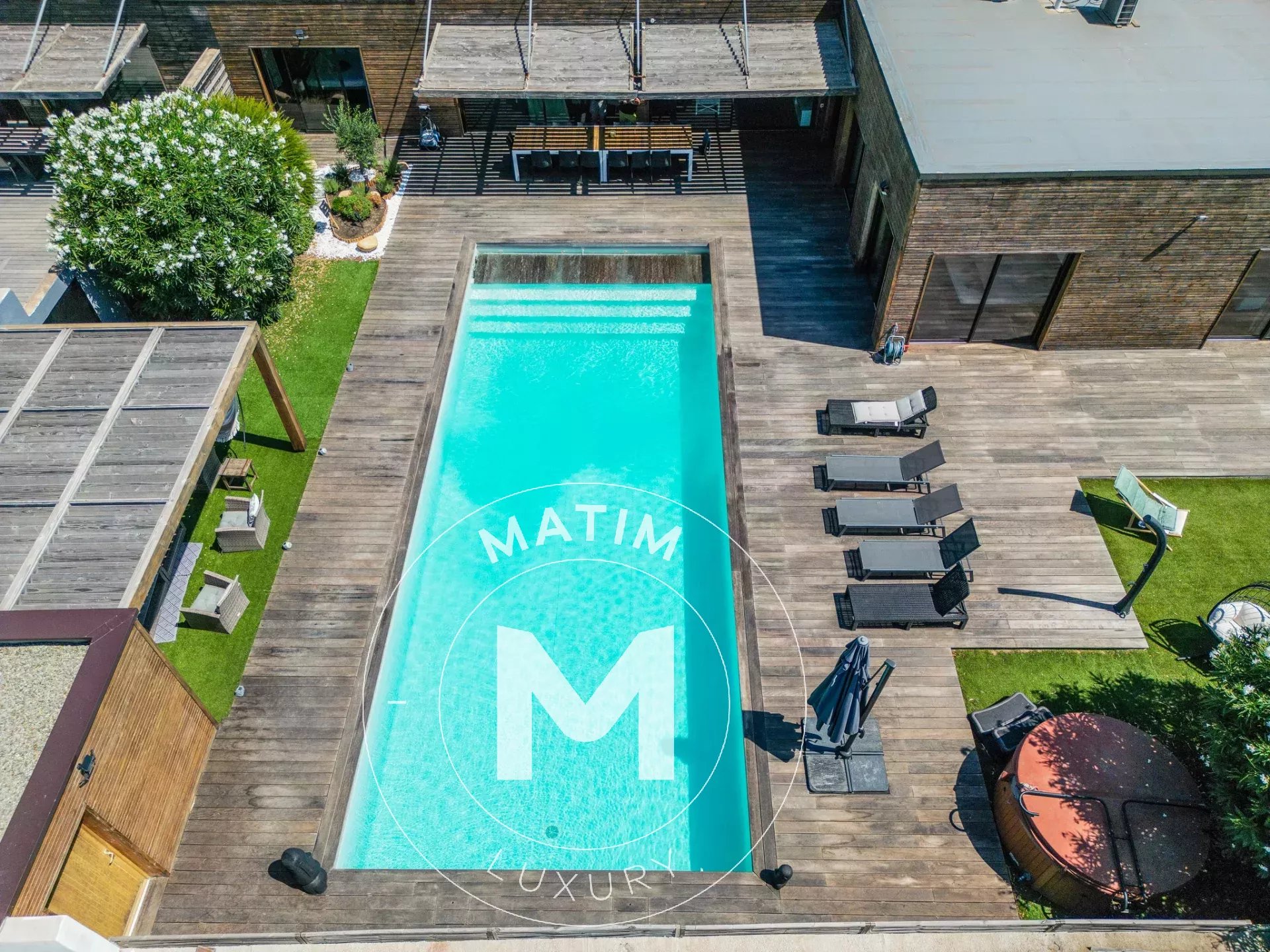 Le jardin arboré d'environ 1 300 m2 accueille une piscine moderne, un jacuzzi propice à la détente, ainsi qu'un terrain de pétanque qui vient rappeler l'authenticité des lieux.