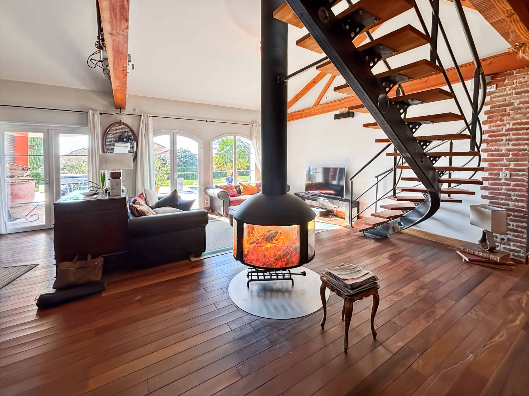 Entrée ouverte sur un séjour cathédrale de 60 m2 avec cheminée