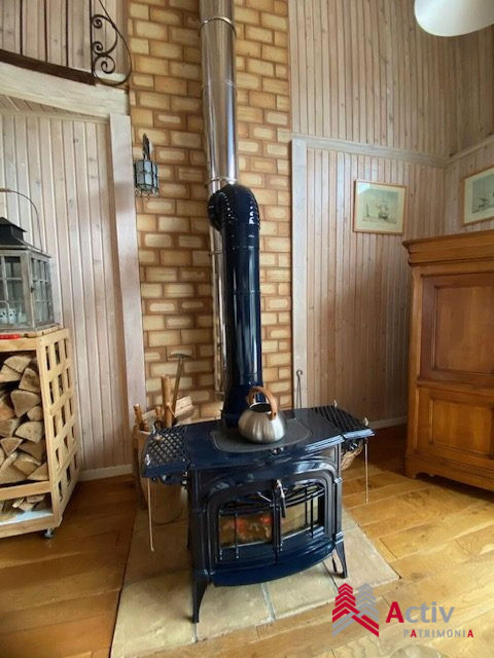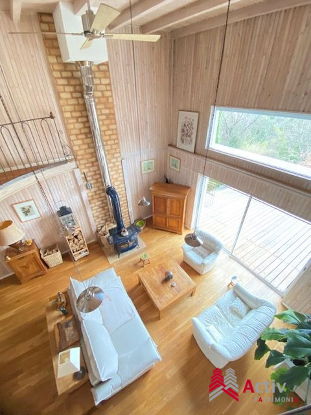 Le séjour, cathédrale de lumière, marie volumes généreux et chaleur du bois, sublimé par un poêle sur mesure.
