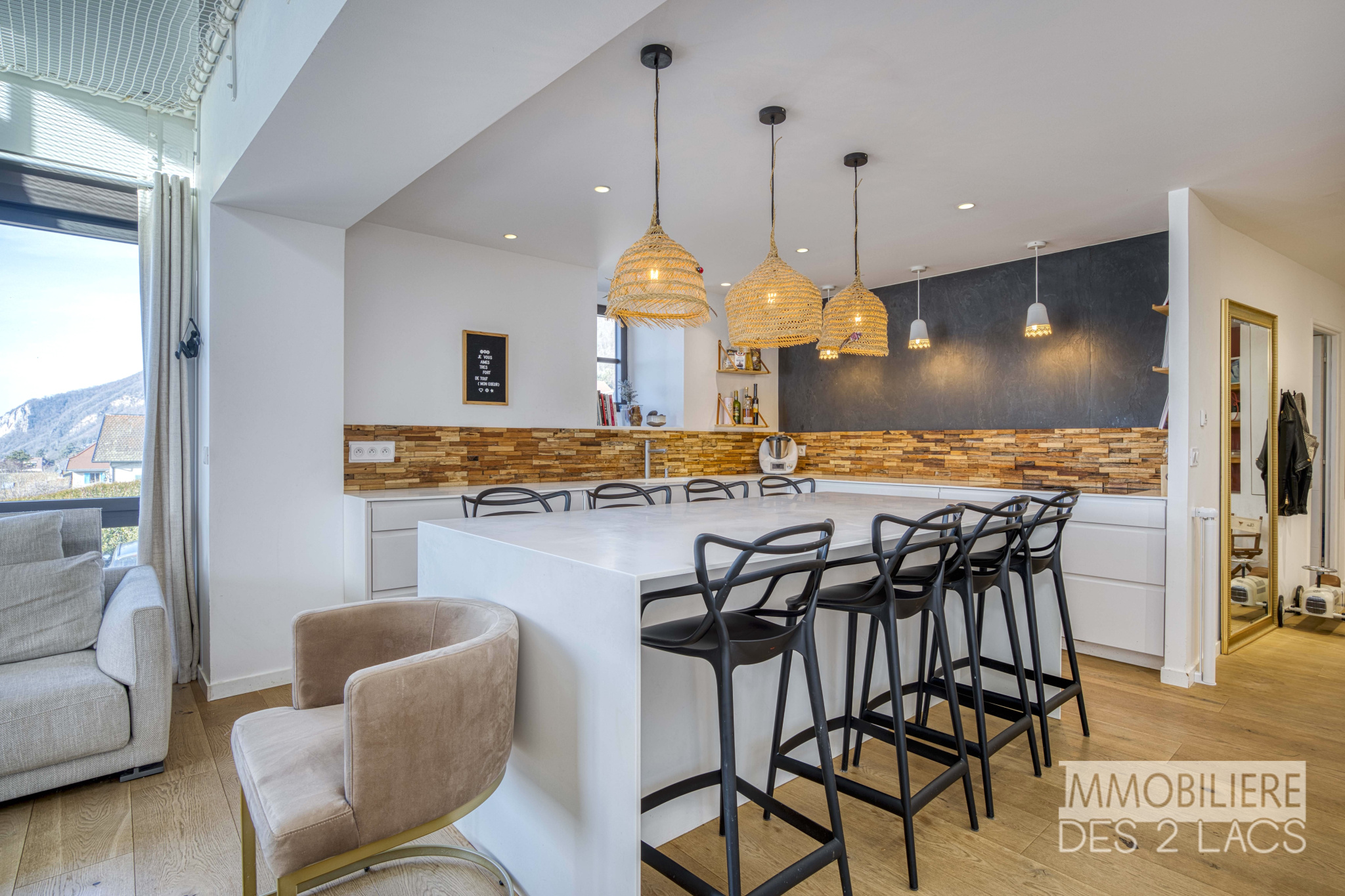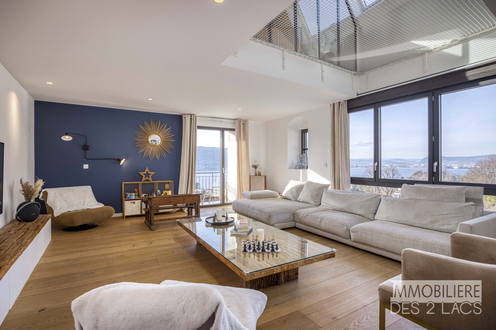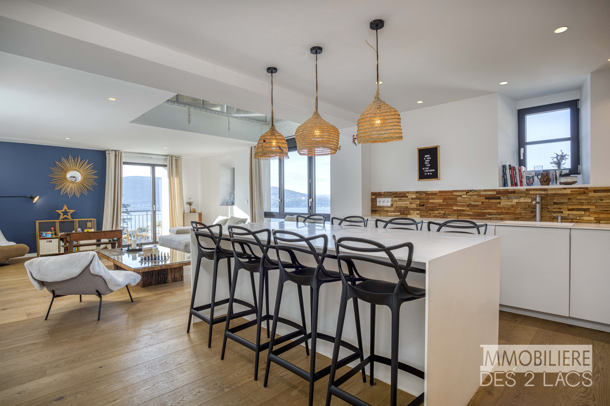 L'appartement s'ouvre sur une très vaste pièce de vie, baignée de lumière conjuguant une cuisine remarquable avec accès direct à un balcon offrant une vue panoramique sur le lac et les montagnes.