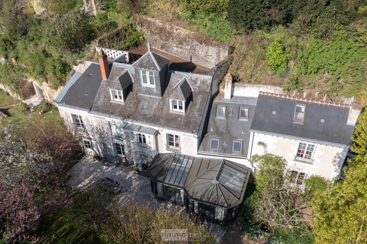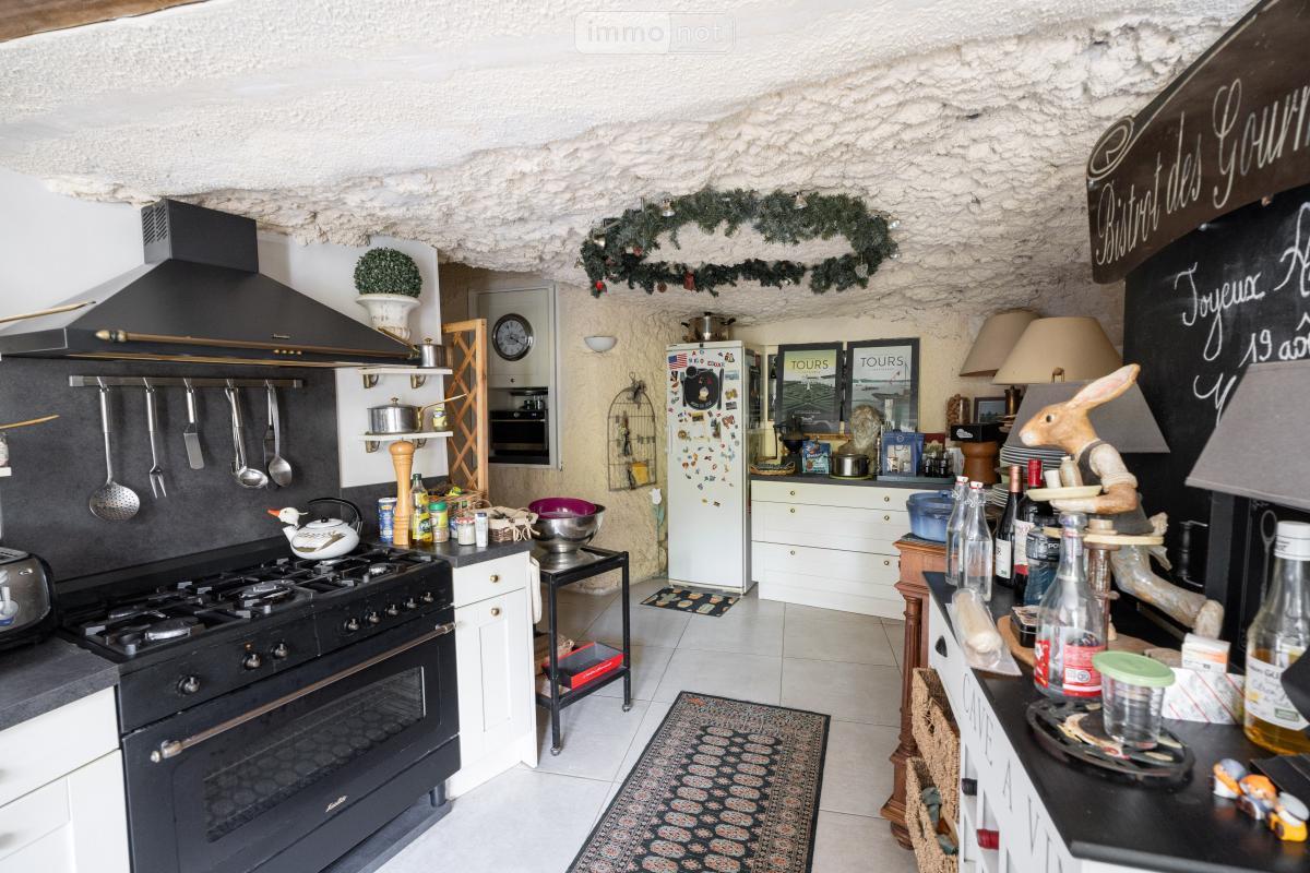 Au rez-de-chaussée, l''entrée ouvre sur un superbe salon prolongé par une véranda (ensemble d''environ 61 m²), baigné de lumière. Dans le prolongement, une salle à manger troglodytique avec cheminée. Cuisine semi troglodytique, spacieuse, bénéficie d''un accès direct à une cave. Un cellier complète ce niveau, et une chambre de plain-pied (actuellement utilisée en bureau) avec salle d''eau.