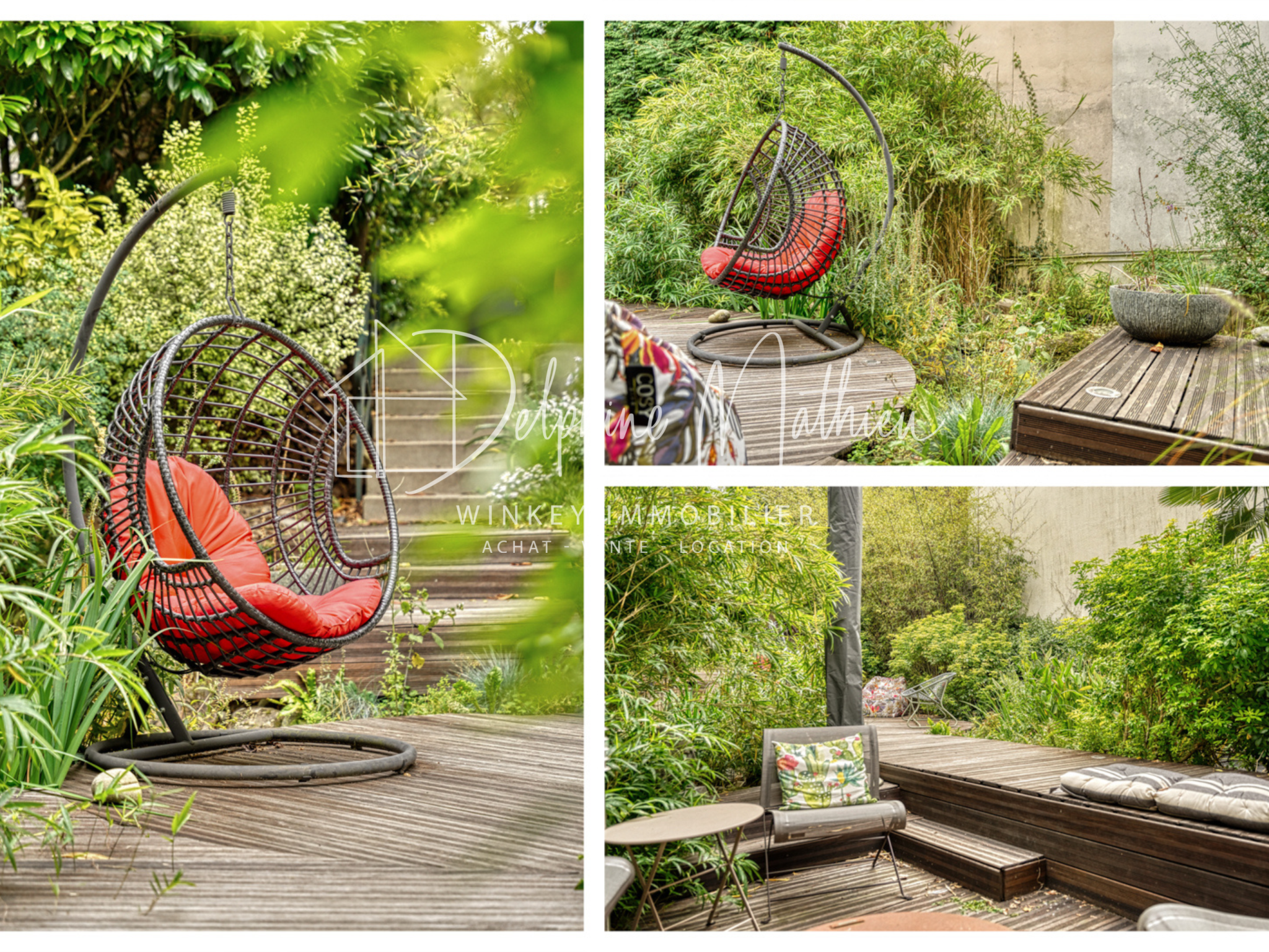 À l'extérieur, la maison s'ouvre sur deux jardins distincts, situés de part et d'autre de la maison, pour une surface totale d'environ 300 m2, chacun offrant une ambiance différente. Côté entrée, un premier jardin paysager dévoile une végétation luxuriante et une succession de bassins peuplés de poissons, créant une atmosphère zen et apaisante, propice à la détente. À l'opposé, côté cuisine, un second jardin ensoleillé accueille une terrasse en bois, idéale pour les petits-déjeuners et les repas d'été. Cet espace se prolonge vers l'arrière de la parcelle par un coin détente intime, à l'abri des regards.