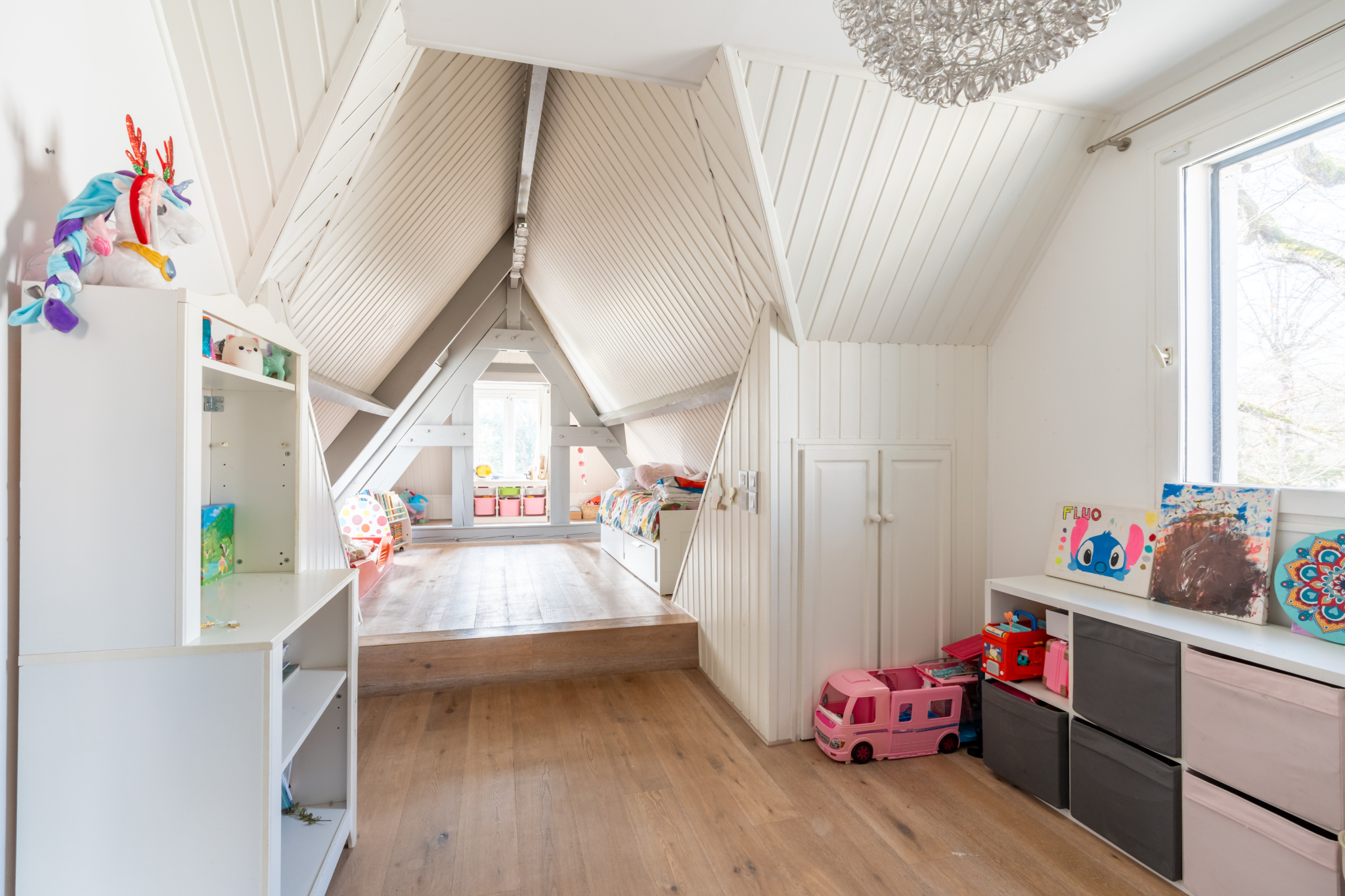 Le premier étage dispose de trois chambres spacieuses, d'une salle de bains et d'une salle de douche. Deux chambres supplémentaires et une salle de douche au dernier niveau parachèvent cet ensemble.