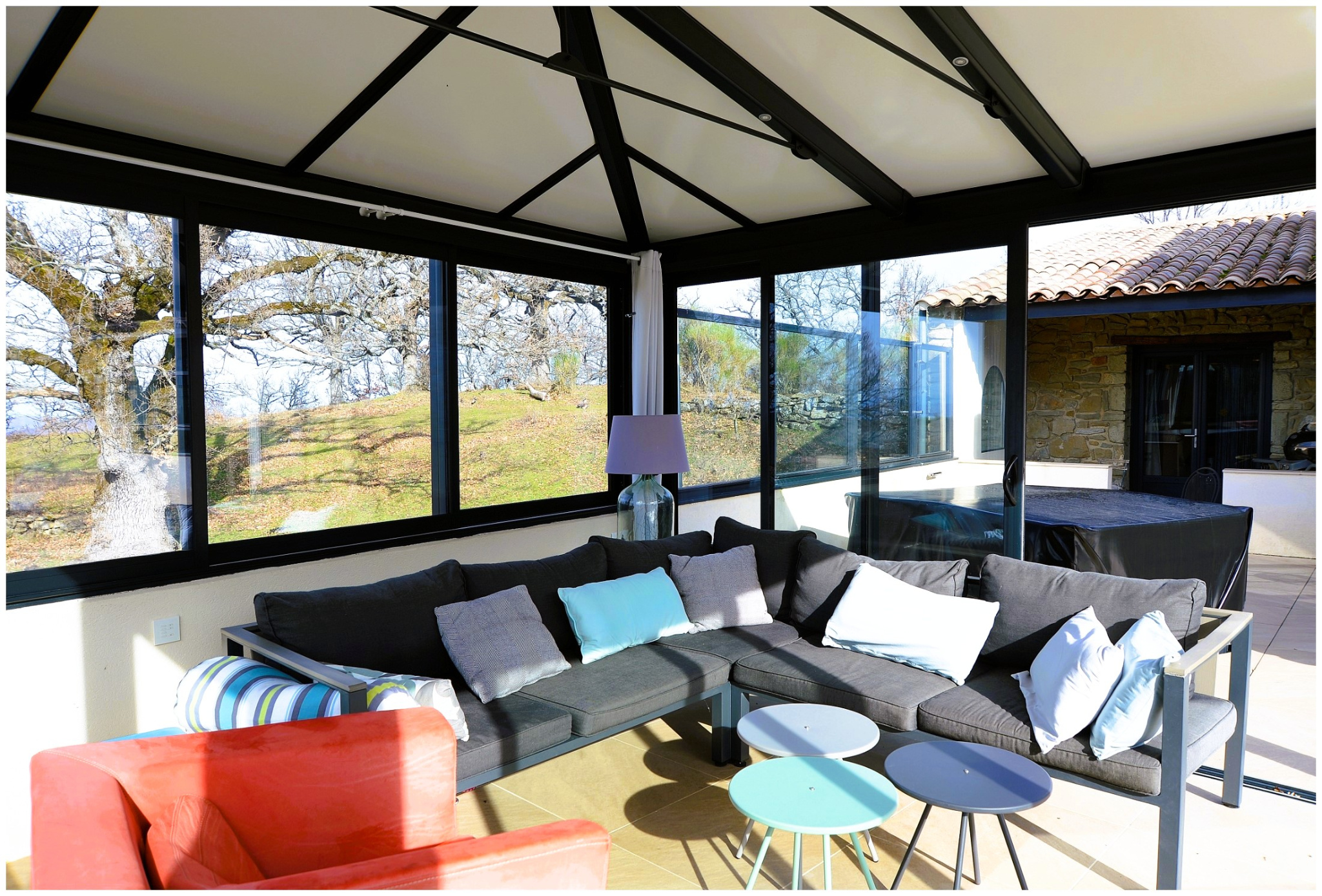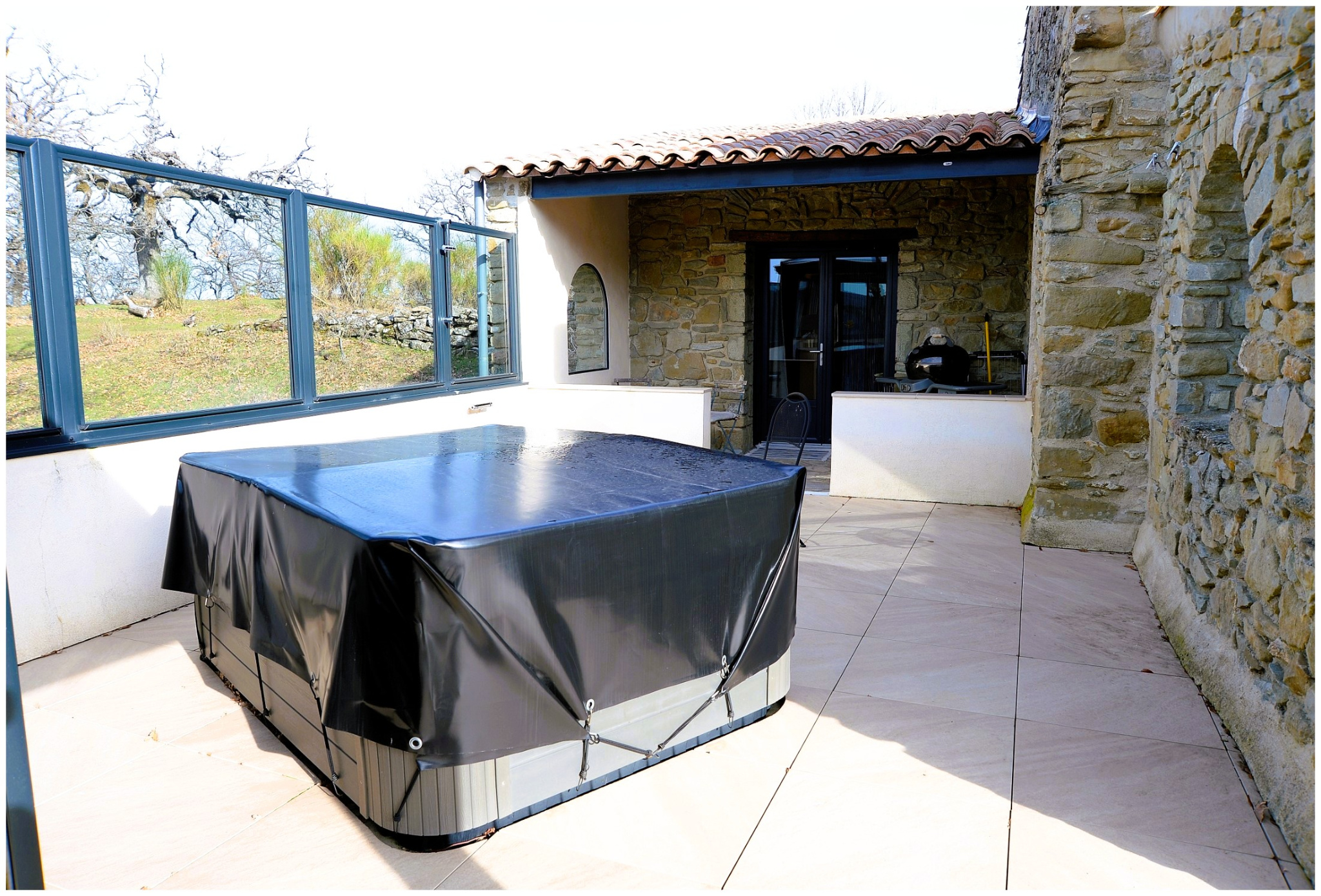 Cette véranda s'ouvre sur une immense terrasse d'environ 80 m2 exposée plein sud avec une vue à couper le souffle ! Elle est agrémentée d'une superbe pergola qui peut être entièrement fermée et jacuzzi.