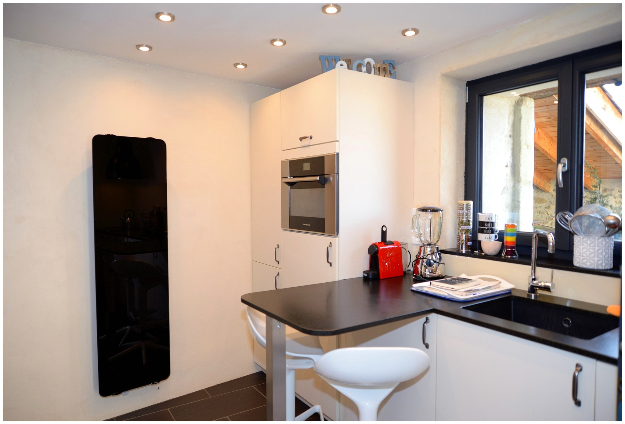 Les équipements sont nombreux : internet Starlink avec relais Wi-Fi dans toutes les pièces, adoucisseur d'eau, menuiseries haut de gamme, volets bois, charpente rénovée et isolée, chauffage central fioul complété par insert bois, PAC air/air et panneaux solaires en autoconsommation et revente (6 kW).